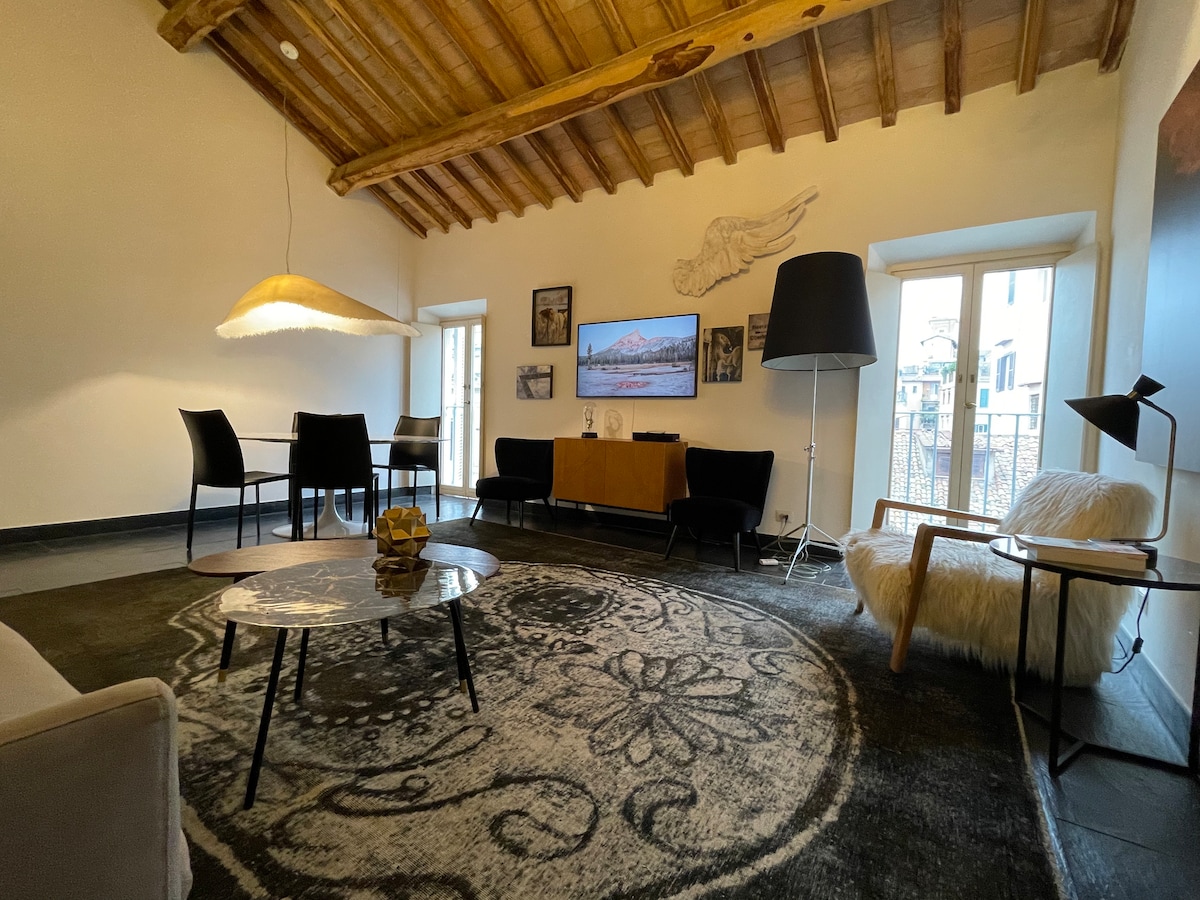 Báječný střešní apartmán o rozloze 120 metrů čtverečních v samém srdci historického centra Říma, který se nachází na slavné ulici Via dei Serpenti, nejkrásnější ulici v Římské čtvrti Monti, která končí výhledem na Koloseum, jen pár kroků od římského Fóra. Podkrovní byt, který má také terasu s výhledem na střechy Říma, se nachází ve starobytném domě z 17. století, který nemá výtah. Proto se nedoporučuje pro starší hosty nebo pro hosty se sníženou pohyblivostí, protože do čtvrtého patra vede mnoho schodů.