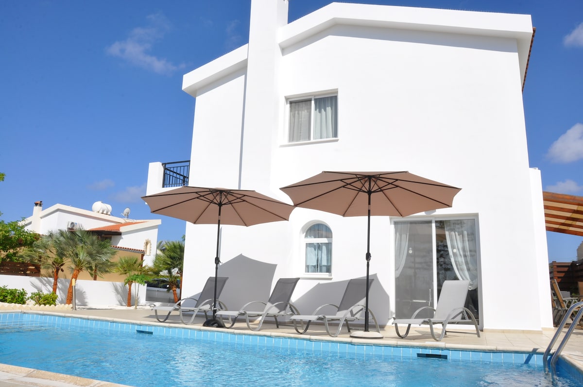 Luxusní samostatně stojící moderní vila v srdci Coral Bay. Prostorná jídelna/obývací pokoj. Nové kuchyňské spotřebiče. Venkovní gril a jídelna. 8metrový bazén s hlubokými a mělkými konci. Prostorná zahrada Sluneční terasa v prvním patře. 3 ložnice s vlastní koupelnou. 2 minuty chůze od místního supermarketu. 5 minut chůze od barů/restaurací 10 minut chůze od pláže Coral Bay, nejlepší pláže na Kypru! Dostatek parkovacích míst, ale pokud chceš tu nejlepší pláž, spoustu zábavy a skvělého jídla, nepotřebuješ auto, je to jen kousek pěšky.