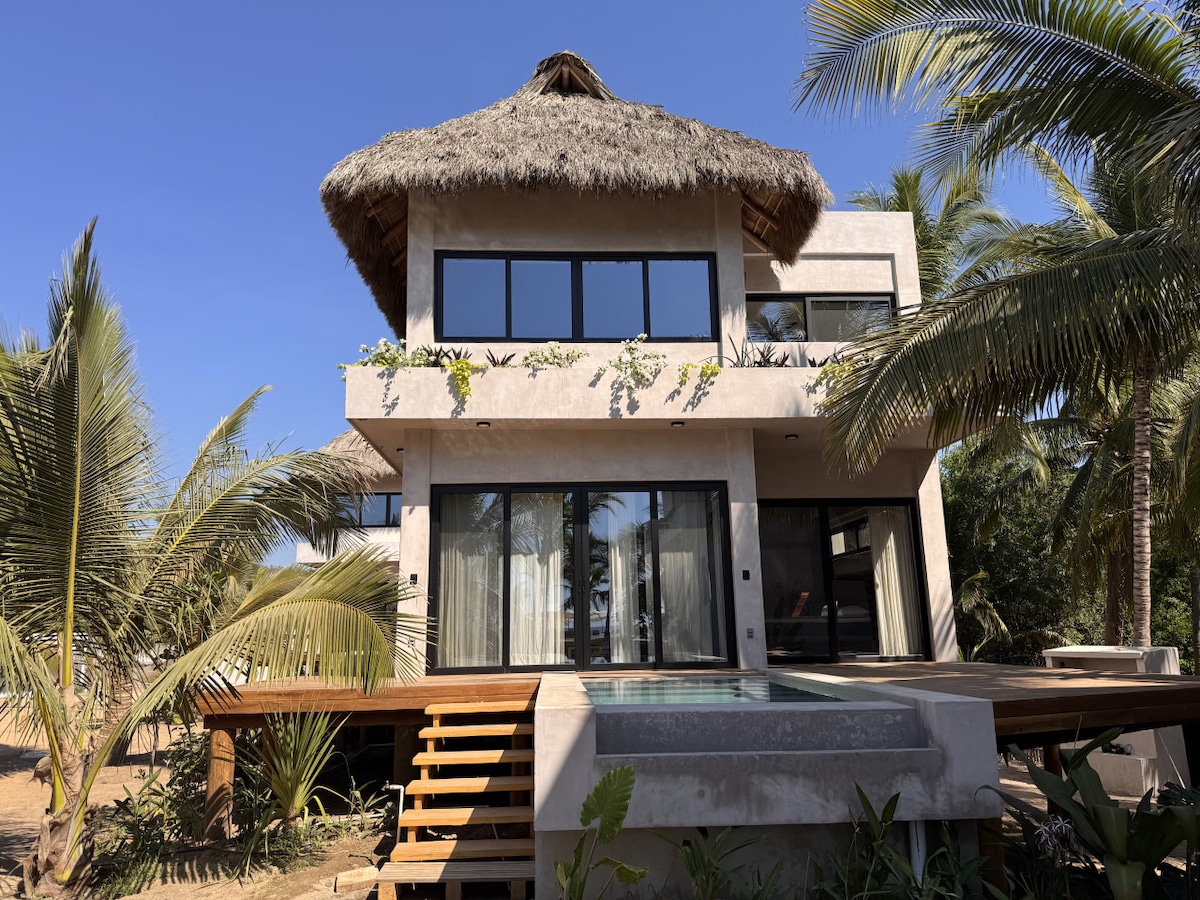 Newly constructed beach villa nestled on the picturesque Costalegre Pacific coast. This spacious two-bedroom home offers an exceptional getaway for ocean lovers. The villa's features wall-to-wall windows, soft and comfortable furniture, gourmet kitchen, private heated pool, great during cooler months. In summer, the pool offers a refreshing escape. Large communal pool, rooftop with panoramic ocean views, on-suite bathrooms, 24-hour security, direct access to beach.