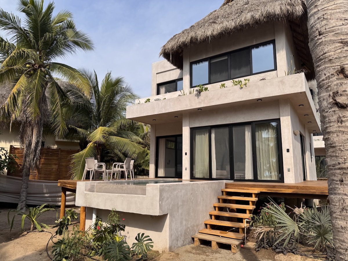 Enjoy our two-story beachfront villa, set directly on the sand. Designed with natural materials, it offers 2 bedrooms (1 with a king bed, 1 with 2 singles that can be joined into a king), a king size sofa bed, and three full bathrooms. The kitchen and living room open onto a terrace and wooden deck with a private heated pool looking over the sea. Completed in Dec 2024, the villa is entirely new. Guests also have access to a shared infinity pool with hammocks and beach umbrellas among the palms.