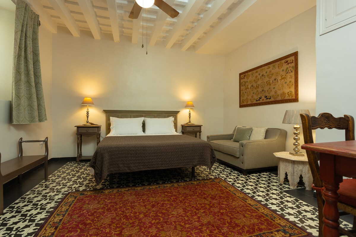 Prostorný pokoj s vysokými stropy v koloniálním stylu a dobovými trámy. Částečně odkryté stěny, aby bylo možné pozorovat původní strukturu domu. Má manželskou postel a plně vybavenou koupelnu se sprchou. Velké okno a 2 malá okna s výhledem na sousední sklep.