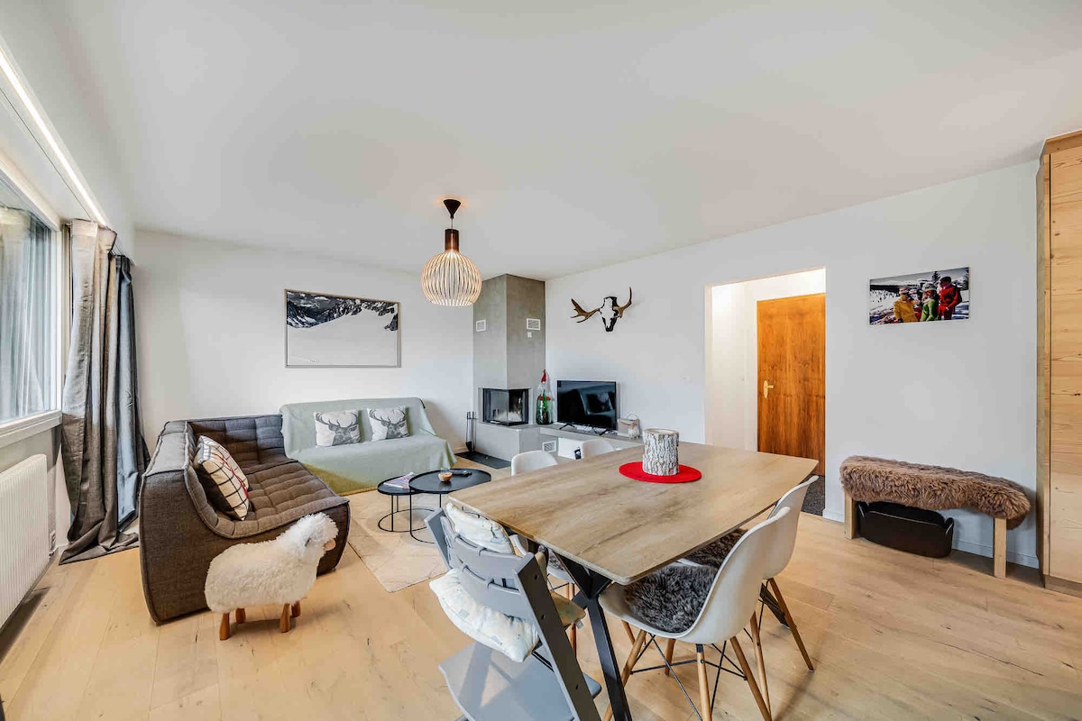 Krásný byt v srdci Cransu s vlastním parkováním. Plně zařízený a vybavený vysoce kvalitními materiály a krbem. Manželská postel (160 cm) se 2 samostatnými lůžky (80 cm) v ložnici. Dětská postýlka na požádání. Rozkládací pohovka v obývacím pokoji (140 cm). Otevřená kuchyně s myčkou nádobí, vybavená pro 6 osob. Jídelní stůl se 6 židlemi. Jedna koupelna se sprchovým koutem a pračkou. TV, vysokorychlostní wifi, Netflix, Bluetooth reproduktor Velká terasa s nábytkem. Součástí je podzemní parkoviště.