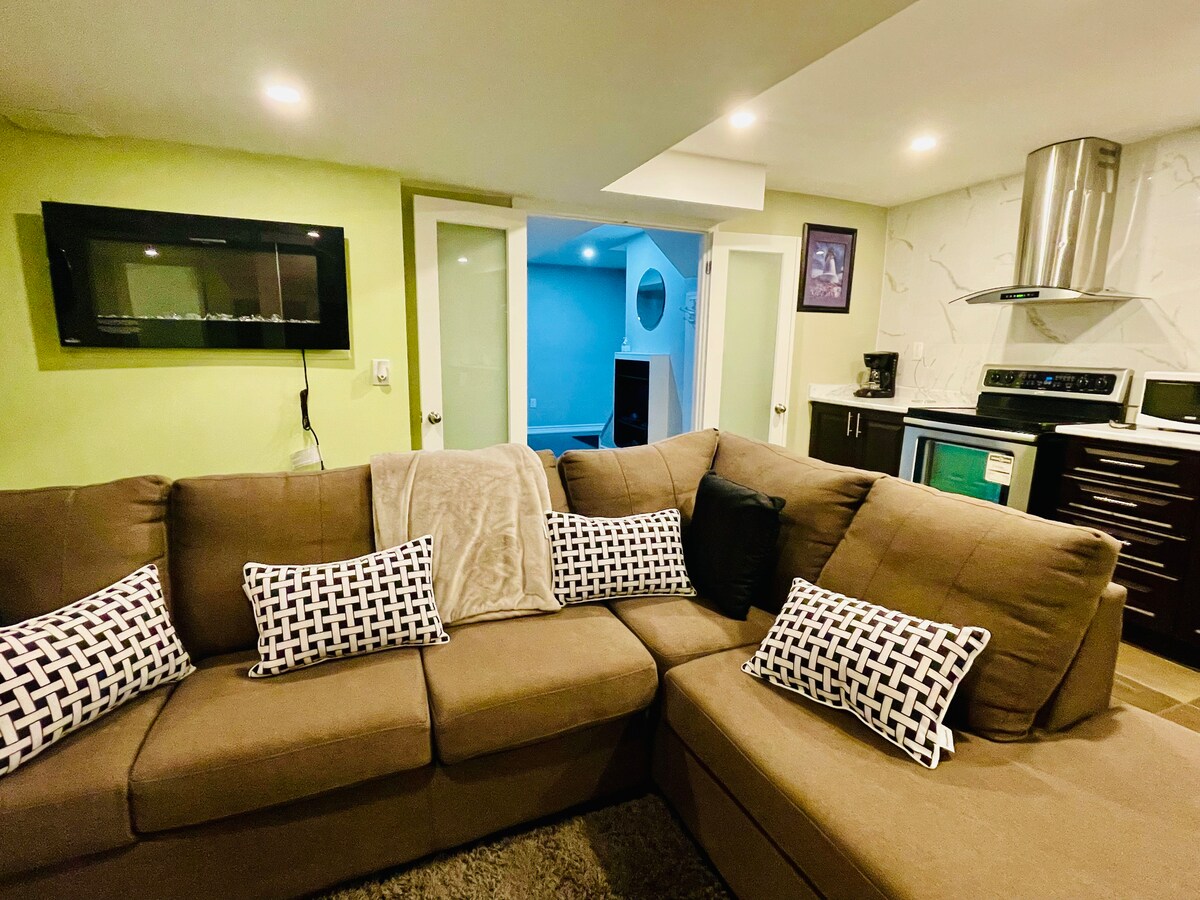 Welcome to our bright, spacious 1,100 sq. ft. unit featuring large windows and a private separate entrance. Enjoy 100% exclusive use of the entire basement, including your own kitchen, laundry room, and free parking. Self check-in makes your arrival easy and flexible. Conveniently located near Square One Mall, and just a 10-minute walk to Raman’s No Frills, T&T Supermarket, and plenty of dining options including Tim Hortons, DQ, Popeyes, Subway, and local pizza shops.