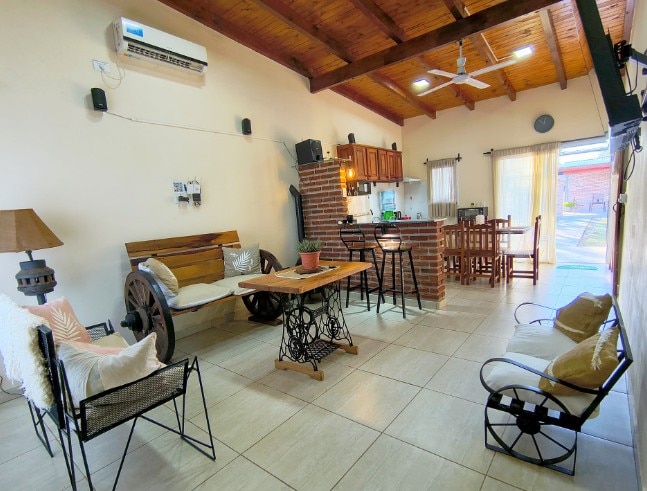 Odpočiň si v tomto jedinečném a klidném ubytování. Na řece Uruguay, obklopené původní vegetací a faunou. Na nejvíce australské trojité hranici. Náš dům má dvě ložnice, jednu s manželskou postelí a druhou se dvěma samostatnými lůžky. V obývacím pokoji je další přistýlka. We have 2 air conditioning cold heat, wifi and Directv. Elektrický sporák a trouba. Plné nádobí pro 4 osoby. Lednice s mrazákem.
