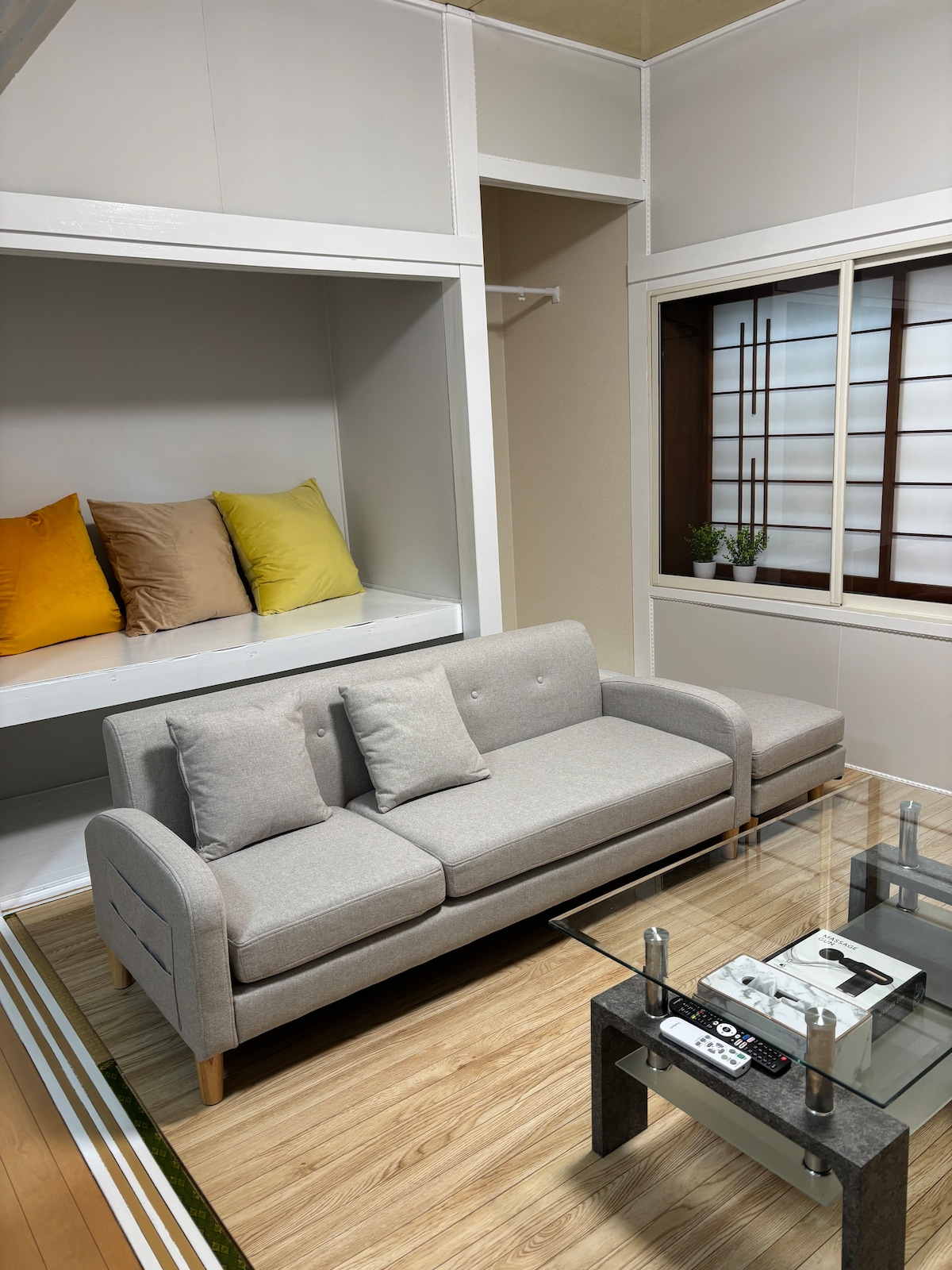 広々とした一軒家&グランピング体験も♪ リビング以外にもお部屋は5つ!!!! ◇デザイン性が高い空間◇ 収納スペースが豊富なため、大人数でご利用の場合も居住空間が散らかりません! ◇団欒とプライベート空間の両立◇ 部屋数が多いため 大人数で集まって過ごすスペースと それぞれが落ち着いて過ごす部屋を両立しています。 ◇おすすめ無料設備◇ リビングではプロジェクターと120インチの特大スクリーンで動画鑑賞可 近くに大型スーパーもあり! グループや家族での滞在にも超おすすめです!! 庭も広々!オプションでBBQやプライベートサウナをお楽しみいただけます 【オプション料金】 ①BBQグッズレンタル(炭なし) ②サウナ小屋(薪あり/オガライト10kg) 全て込みのセットで¥24,000 クーラーはリビングに1台のみ。 (扇風機は複数台あり) 暖房は各部屋完備。 *1Fにホスト居住スペースあり、立ち入り禁止区画あり 詳しくはお問い合わせください 2026年4月1日より 宿泊代には宿泊税が含まれています。 別途、宿泊税を徴収するわけではありません。