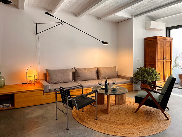 75m2 loft apartment with modern and unique architecture. Carefully designed, decorated with vintage-style furniture and art carefully selected over the years. This combination, along with a spectacular and impressive view over the bay of Cadaqués, makes it absolutely unique. It is located just 1 minute walk from Es Poal beach, about 45m away. PET friendly. We love animals. Please inquire privately about the extra cost per night for your adorable and furry friend.