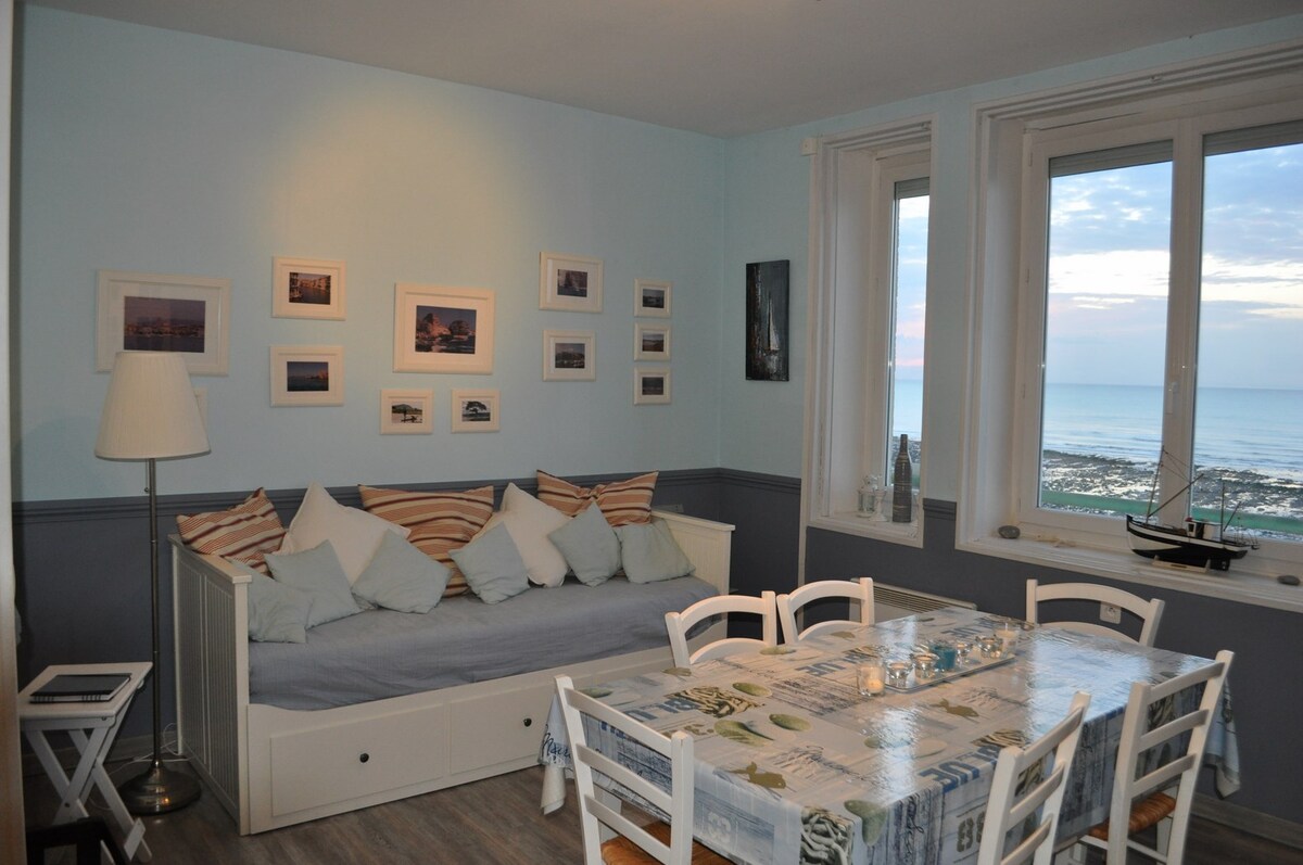 66 m2 sur front de mer TRES LUMINEUX avec balcon TBE . Déco Très soignée WIFI classé 4 étoiles par l'asso départ et SUPERHOST par Airbnb. VUE EXCEPTIONNELLE sur mer, falaises, la jetée, le coucher de soleil , entrée des bateaux 1er étage sans ascenseur Près du golf 18 trous, château , musée mer , centre ville à 5 mn à pied Foire d été 2è quinzaine d'août sur front de mer N°76217000387D1
