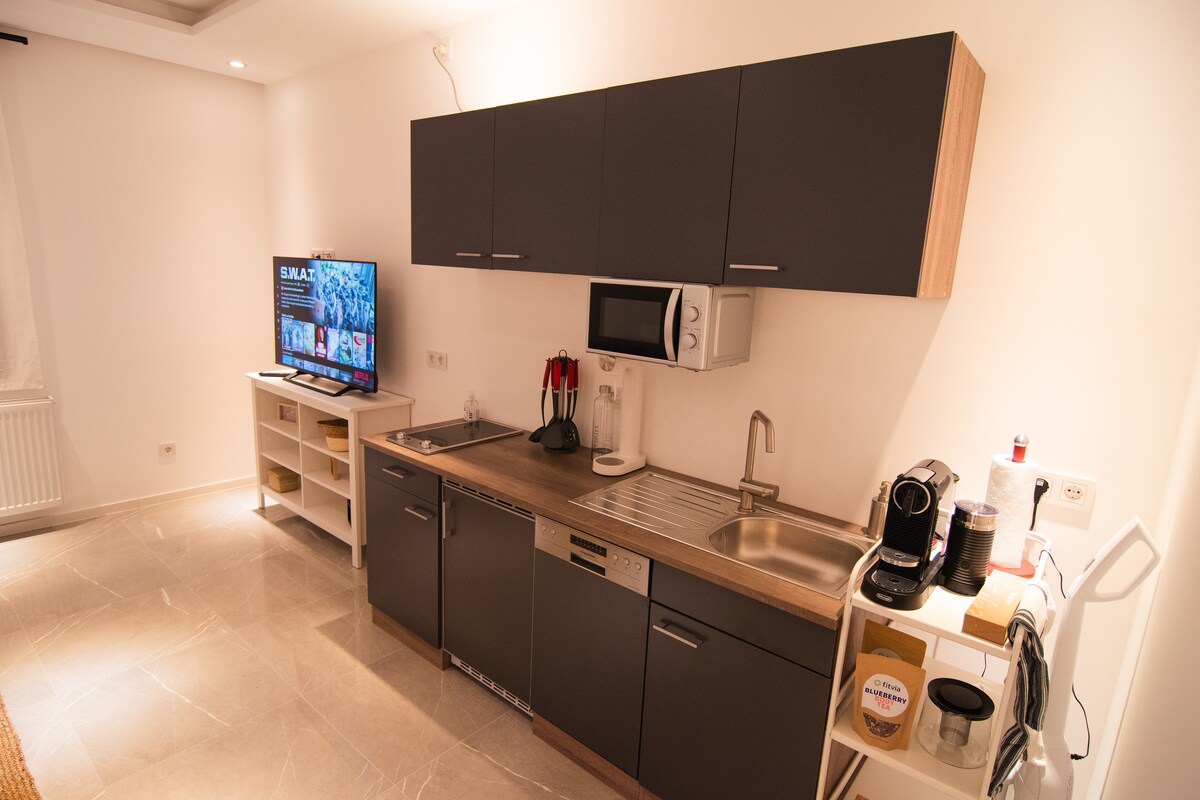 Náš kompletně zrekonstruovaný a moderně zařízený jednopokojový apartmán nabízí vše, co potřebujete pro pohodlný a relaxační pobyt v malém prostoru – ideální pro páry, sólo cestovatele nebo obchodní cestovatele. Kombinovaný obývací a spací prostor je světlý a přátelský. Velkými křídlovými dveřmi máte přístup na malou terasu, kde si můžete užít slunce s výhledem na Horní zámek. 🏰