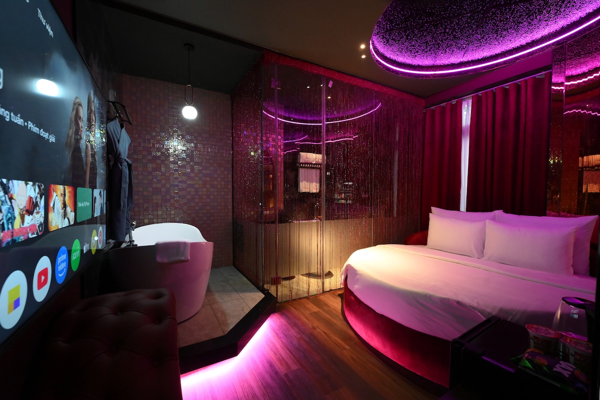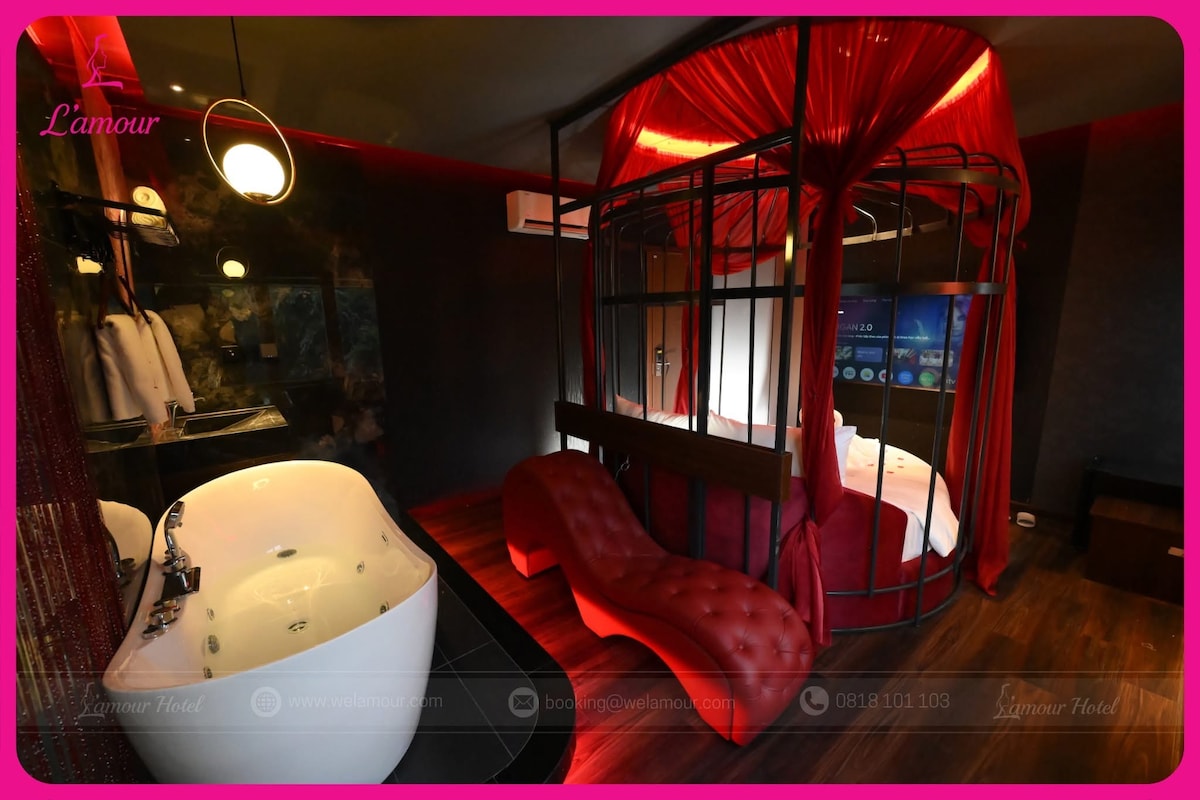 L’amour Hotel sở hữu 29 phòng nghỉ thiết kế theo phong cách Nhật – Trung – Âu, nổi bật với gam hồng – đen đặc trưng, mang đến không gian tinh tế và lãng mạn. Mỗi phòng là một thế giới cảm xúc riêng, chú trọng ánh sáng và bố cục hài hòa. Tọa lạc gần sân bay, khách sạn được trang bị TV 55” Netflix, bồn tắm Jacuzzi, thiết bị vệ sinh cao cấp cùng lễ tân trực 24/24, đảm bảo sự riêng tư, tiện nghi và trải nghiệm trọn vẹn cho kỳ lưu trú ngắn ngày.