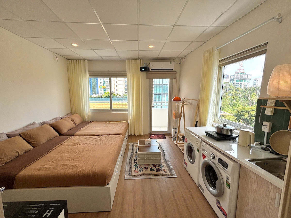 _Cozy apartment in the heart of bustling Saigon. Modern space with full amenities. * High speed internet - 150Mbps * Watch movies with NETFLIX _35m2 studio includes a Queen size bed, TV with Netflix, washer + clothes dryer and hot water. _The window faces a cool green area. _Full body mirror _5 mins walk from Bui Vien Street. _5 mins walk from the metro station. _5 mins walk from Ben Thanh Market. _8 mins walk from Nguyen Hue walking street _ There are many restaurants and cafes around.