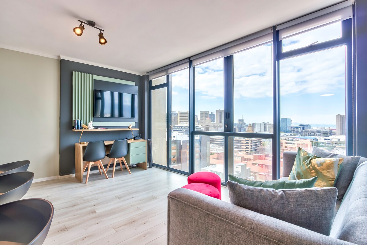 OBLÍBENÉ U HOSTŮ! Vítejte ve svém útočišti v Kapského Města! Prostor je obrovský, čistý a interiérový design kombinuje pohodlí a sofistikovanost. Každý večer se budete cítit jako doma v útočišti plném relaxace a luxusu. Hosté si tento příbytek oblíbili. Díky dechberoucím výhledům slouží tento apartmán jako dokonalá základna, ze které se můžete ponořit do divů města. Cartwright's je bezpečná a zabezpečená budova. V blízkosti restaurací, muzeí. Ideální pro práci z domova s rychlou wifi!
