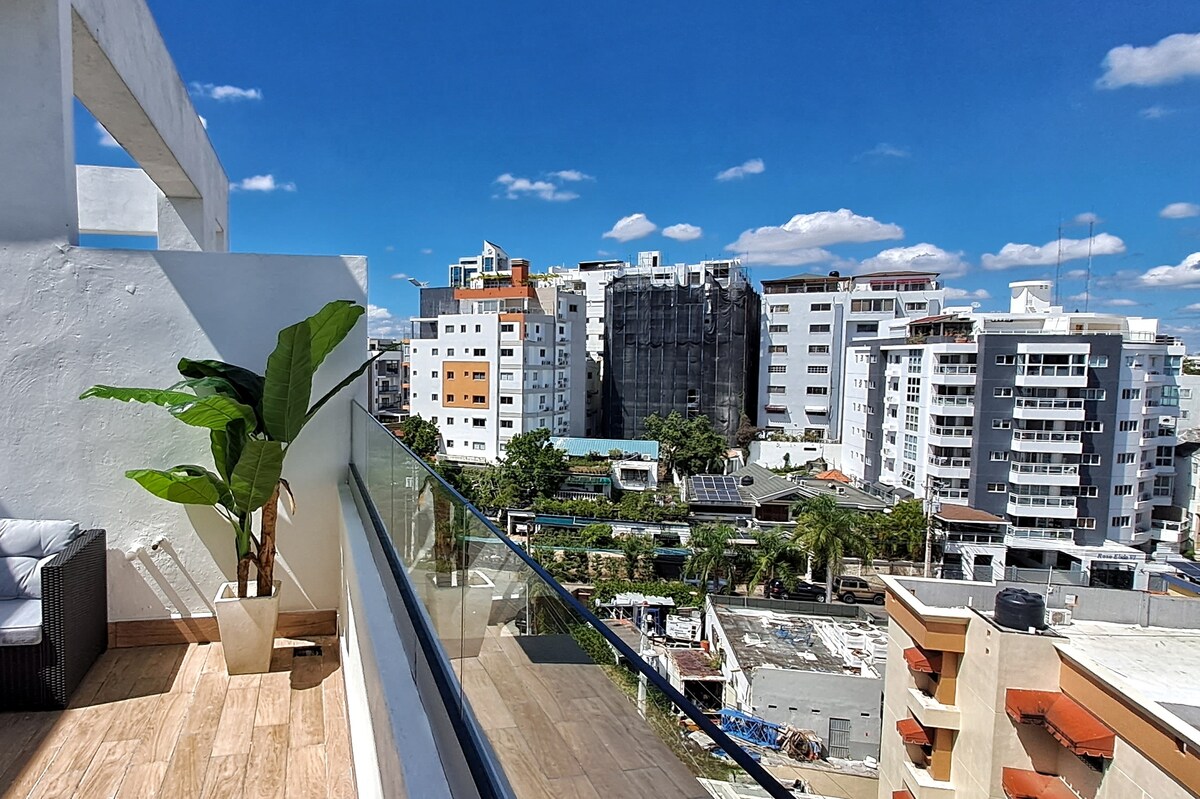 Tento byt je sen. Nachází se v nejvíce prémiové oblasti země, Piantini, vše je blízko. Tento byt se nachází ve čtvrtém patře s nádherným výhledem na hlavní město. Zahrnuje dvě ložnice a 2,5 koupelny a může ubytovat až 5 osob. Zahrnuje vybavenou kuchyň, pračku a sušičku. Tato budova má společenský prostor o rozloze 1 200 metrů čtverečních, který se skládá ze střešního nekonečného bazénu, posilovny, zenového prostoru a dětského hřiště.