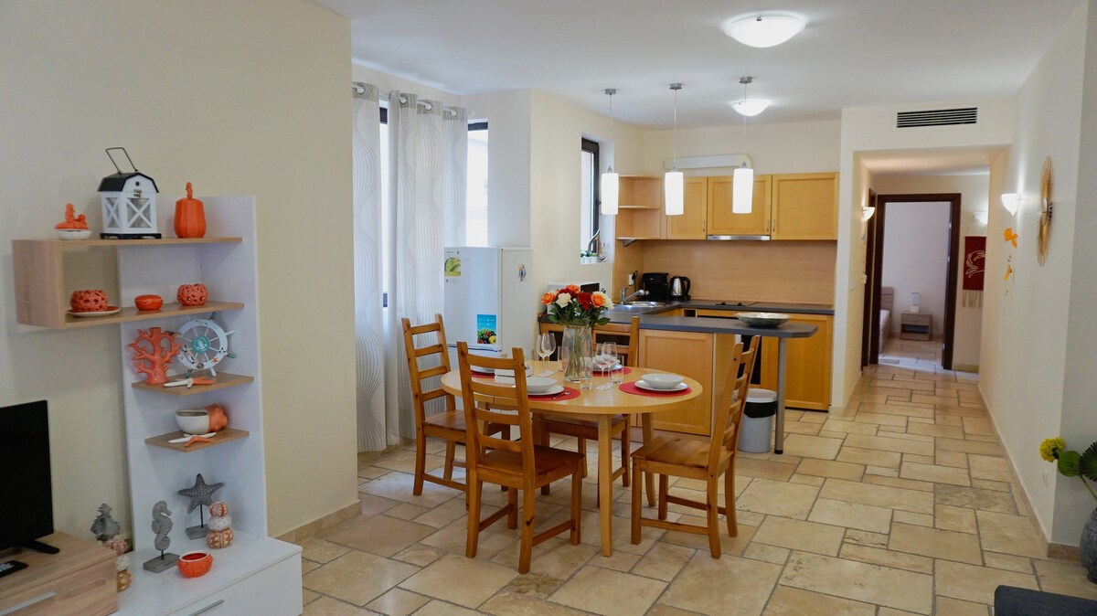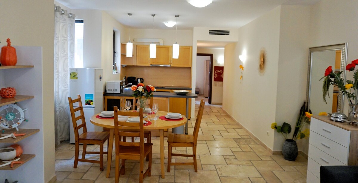 Луксозно обзаведен апартамент на първа линия с изглед към морето. Разположен е в центъра на град Балчик, в непосредствена близост до плажа, яхтеното пристанище и централната приморска улица. Предлага се с безплатен достъп до плувен басейн с шезлонги, разположен на същото ниво. Разполага с индивидуален климатик, телевизия, интернет, както и напълно оборудвана кухня. Подходящ е за семейства с деца. Апартаманта е част от Марина Сити Апарт Хотел.