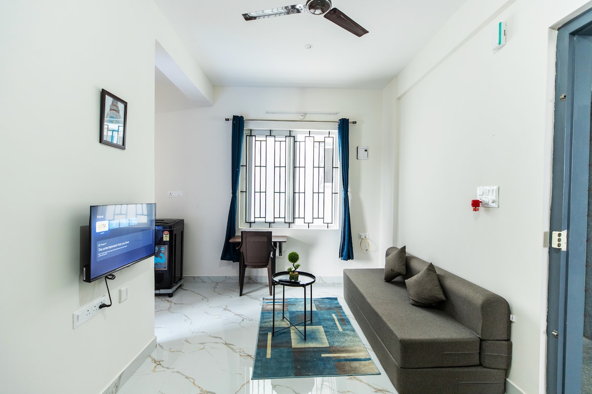 Škeble s jednou ložnicí ☀️ Zažij domov daleko od domova v našem vzdušném 1BHK s úžasným výhledem, ideálním pro profesionály a rodiny. Nachází se v blízkosti Infosys a Wipro, užij si moderní vybavení: pračku, lednici, mikrovlnnou troubu, sporák, varnou konvici, kávovar, Wi-Fi, 55" chytrý TV a stolní tenis. Uzavřená komunita vhodná pro domácí mazlíčky pro větší bezpečnost. Odpočiň si na balkóně s panoramatickým výhledem. Rezervuj si pobyt a užij si dokonalou kombinaci pohodlí, komfortu a klidu!