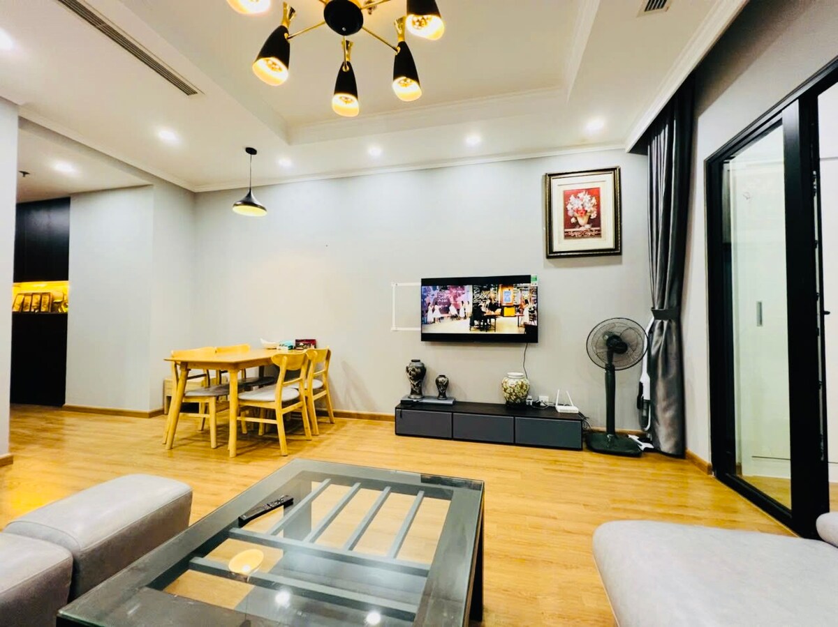 Prostorný 3pokojový apartmán v budově R2 – Vinhomes Royal City, 72A Nguyen Trai, Thanh Xuan, Hanoi, s otevřeným výhledem na město a moderním, sofistikovaným designovým prostorem. Luxusní nábytek, plně vybavené, vhodné pro rodiny nebo skupiny přátel, kteří chtějí pohodlně bydlet v centru Hanoje. Přímo u paty budovy se nachází nákupní centrum Vincom Mega Mall s různými obchody, restauracemi a zábavními prostory – to vše jen pár kroků od hotelu.