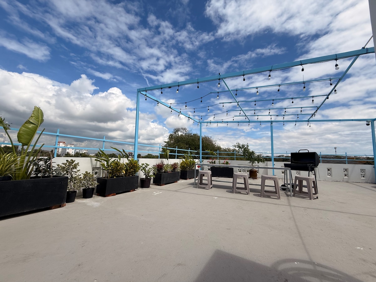 In the heart of the city, this spacious villa boasts 3 bedrooms and 3 bathrooms. There is a sunlit living room, fully-equipped kitchen, guest toilet on the ground floor. Enjoy lush green surroundings, a garden with a decorative pond, and a parking for scooters and one car. Amenities include AC in living and bedrooms, WiFi, 2 TVs, washing machine, dryer, and essentials like bedsheets and toiletries. Located near local foods, supermarkets, and 1.5 km from Doi Duong Beach.