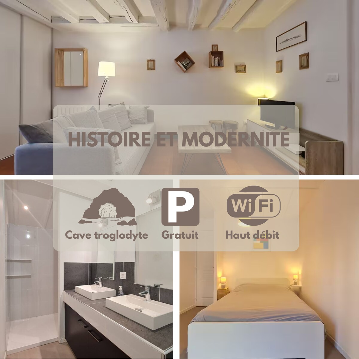 Klimatizované studio s nádherným výhledem na hrad, velmi útulné s odhalenými trámy, klidná, stará čtvrť, 5 minut chůze od centra města, s restauracemi a obchody, mezi Château a Loire, naproti cyklostezkám. Otevřená americká kuchyně vybavená lednicí, plynovým sporákem, mikrovlnnou troubou, rychlovarnou konvicí atd. Manželská postel + velmi pohodlná rozkládací pohovka a 1 malá rozkládací postel. Dětská souprava. Sprcha, umyvadlo, samostatné WC. Wi-fi. pračka a sušička v budově. Soukromý dvůr, parkování zdarma