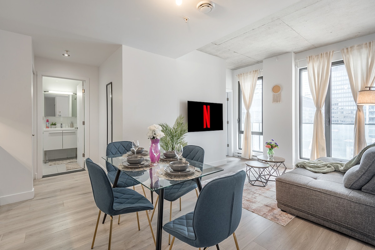 Užij si pobyt v centru města! Zbrusu nový luxus TDC 2 v centru města s přímým přístupem do Bell Center! Vychutnej si pohodlí v našem plně zařízeném a vybaveném apartmánu s jednou ložnicí a vlastním balkonem! Váš pobyt zahrnuje přístup do sauny, bazénu, posilovny, skylounge, herny, salónu a na terasu s několika grily. Bezplatné podzemní parkoviště, metro je jen pár minut odtud. Město je tvé k prozkoumání, aniž bys musel/a vyjít ven. Navíc si můžeš odpočinout s bezplatným Netflixem pro dokonalý pobyt