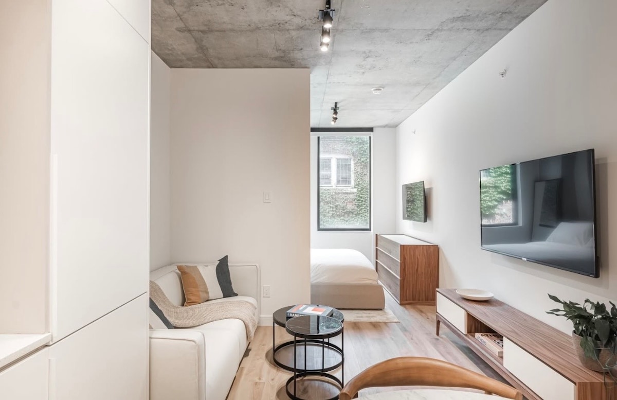 Super nový studio, zařízený, v nejvyšším patře, k pronájmu! 2 kroky od stanice metra St-Laurent, UQAM a Latinské čtvrti Velmi dobře umístěné na ulici St-Catherine mezi Place des Arts a Village na křižovatce s ulicí St-Elizabeth Plně zařízené: postel s matrací, lednice a mraznička, trouba, myčka nádobí, mikrovlnná trouba, pračka a sušička Střešní terasa, posilovna a coworkingový prostor