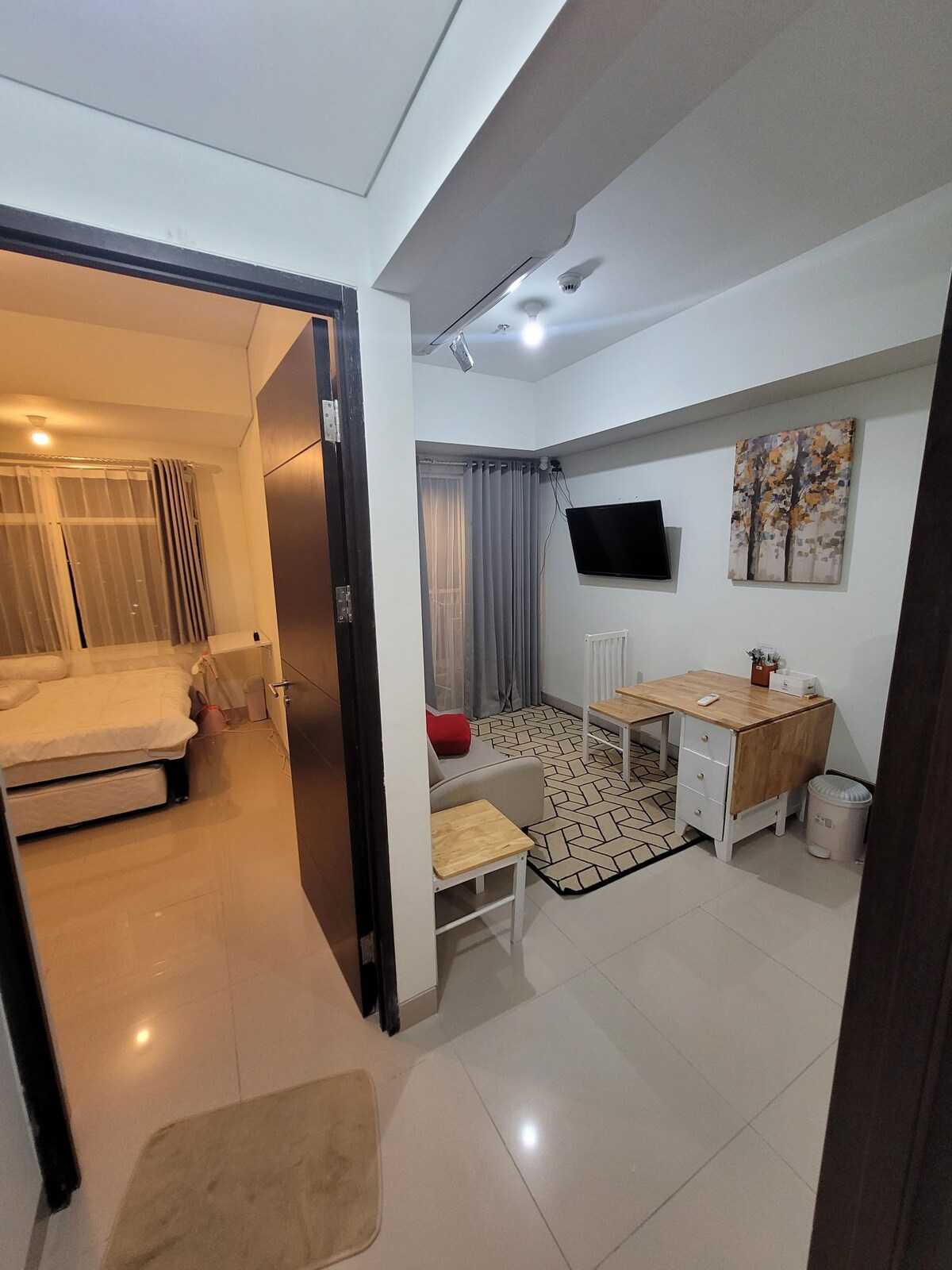 Elegantní garsonka s přístupem do nákupního centra v Tanglin Supermall Mansion - Surabaya Plně zařízené (Spec & Facilities): - Menší manželská postel 160 x 200 - Rozkládací pohovka (může být rozložena do matrace se samostatnou postelí) - Aircon - Lemari Baju - Kuchyňská sada - Panoramatický výhled na město - 2. patro - Chytrá televize 32palců - Wifi - kulkas & Frezzer - Meja Makan Veřejná zařízení : - Bazén (1. patro) - Posilovna (přízemí)(GF) - Prádelna (přízemí)(GF) - Pakuwon mall direct access (Ground Floor)(GF)