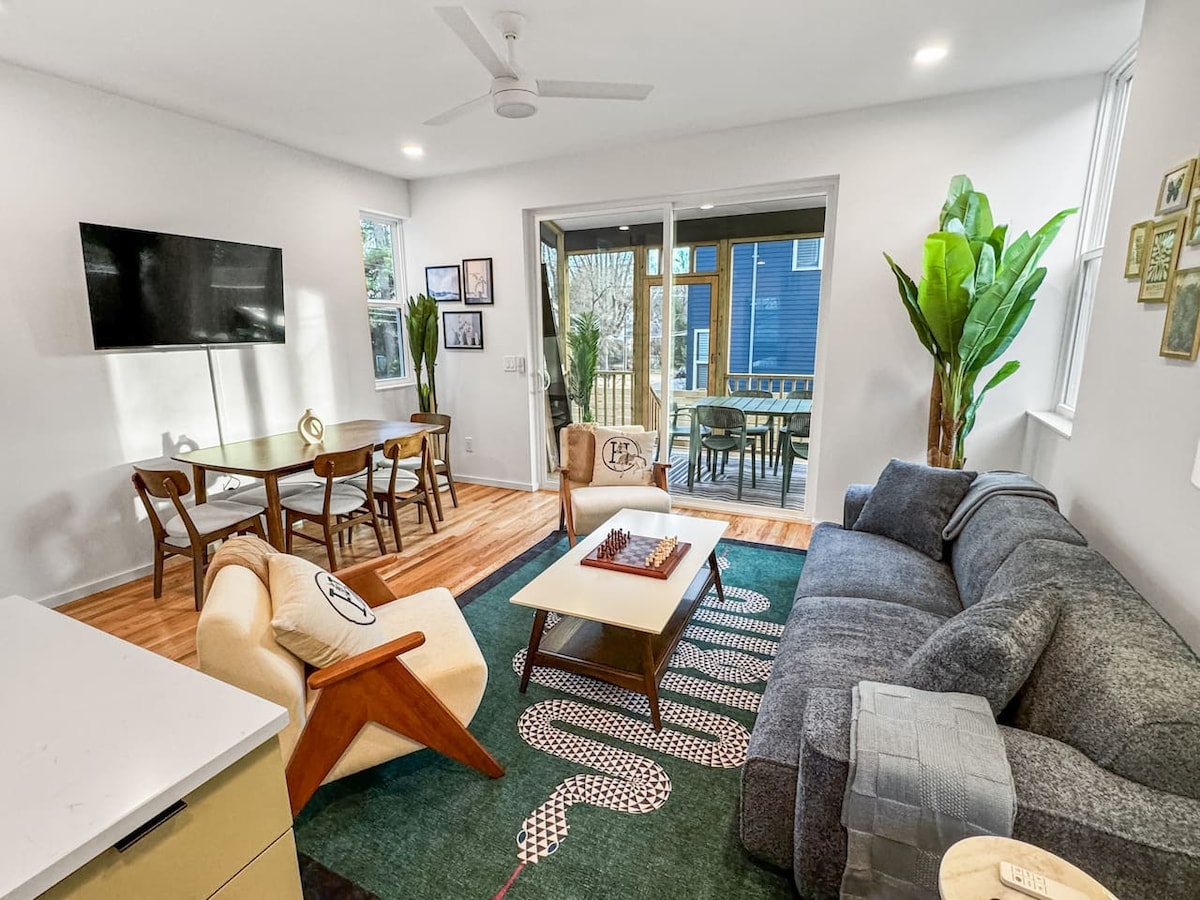 Vítej ve své oáze v Old North Durham! Náš okouzlující 100 let starý dům, inspirovaný zahradami Sarah P. Duke Gardens, nabízí dokonalou kombinaci historie a moderního designu. Toto ubytování vhodné pro děti a domácí mazlíčky se nachází pouhých 5 minut chůze od Central Parku a 10 minut od centra města. Na zahradě najdeš ohniště, lehátka a terasu. Tento příjemný domov, pečlivě zařízený renomovaným interiérovým designérem, je připraven tě přivítat. Ať je to tvůj domov daleko od domova!