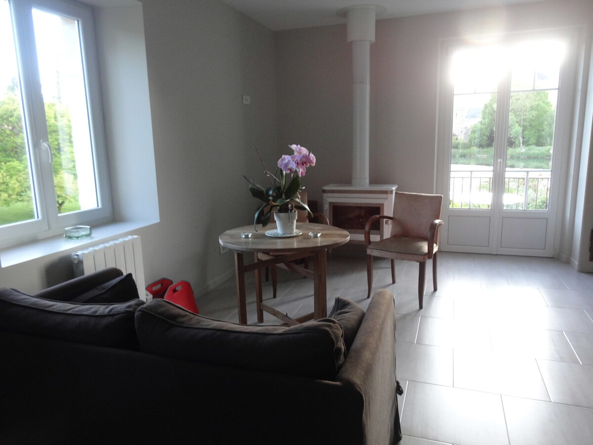 Beau logement indépendant ensoleillé de 60 m2 dans ancienne écurie Balcon surplombant la rivière avec vue unique sur le château de Durtal , séjour avec cuisine américaine, poêle à bois 2 chambres ,une avec lit double , porte fenêtre donnant sur la campagne ,une chambre avec 2 lit simples 1 salle d'eau , WC séparés La propriété est grande, arborée et abondamment fleurie Un bateau, 2 vélos sont à votre disposition, une balançoire, un trampoline, et une cabane dans un arbre .