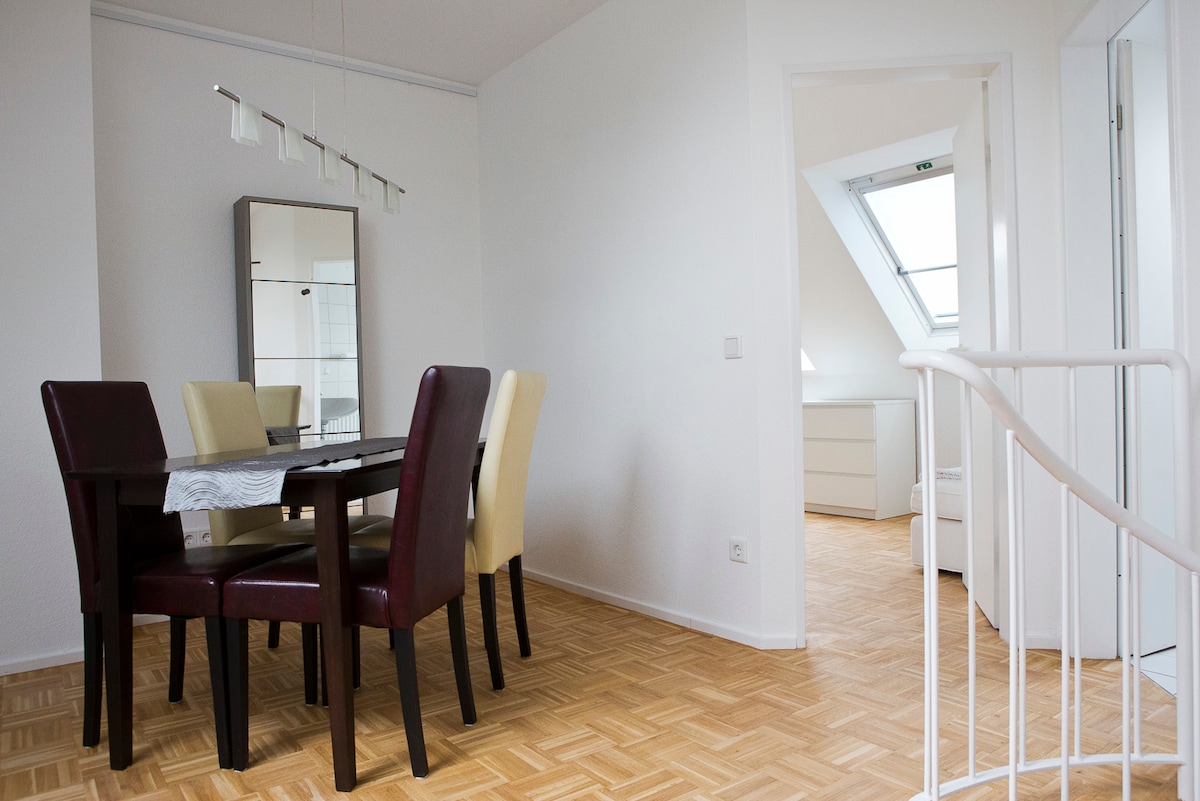 This spacious, bright duplex apartment offers everything to make you feel at home. Fully equipped with premium-quality, modern designer furniture and state of the art technical devices this secluded home is located in the sophisticated area of Düsseldorf Benrath. It's proximity to public transportation makes it easy to get to the Fair Trade/MESSE, airport, inner city of Düsseldorf and to Cologne. The river Rhine and Benrath castle, restaurants & grocery stores are just in walking distance.