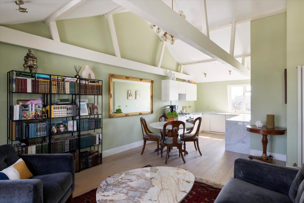 Bright 2-bed top-floor flat in a stunning Victorian Chelsea conversion. Vaulted ceilings, exposed beams, open-plan living, and stylish art deco bathroom. Quiet with lovely views and access to communal gardens. Note: 4th floor walk-up. Enjoy iconic local restaurants and easy walks to Fulham Rd, King’s Rd, and Earls Court Tube. Perfect for a stylish, peaceful London stay with character! Note: the property is marketed for sale so there may be a few viewings with advance notice from September.