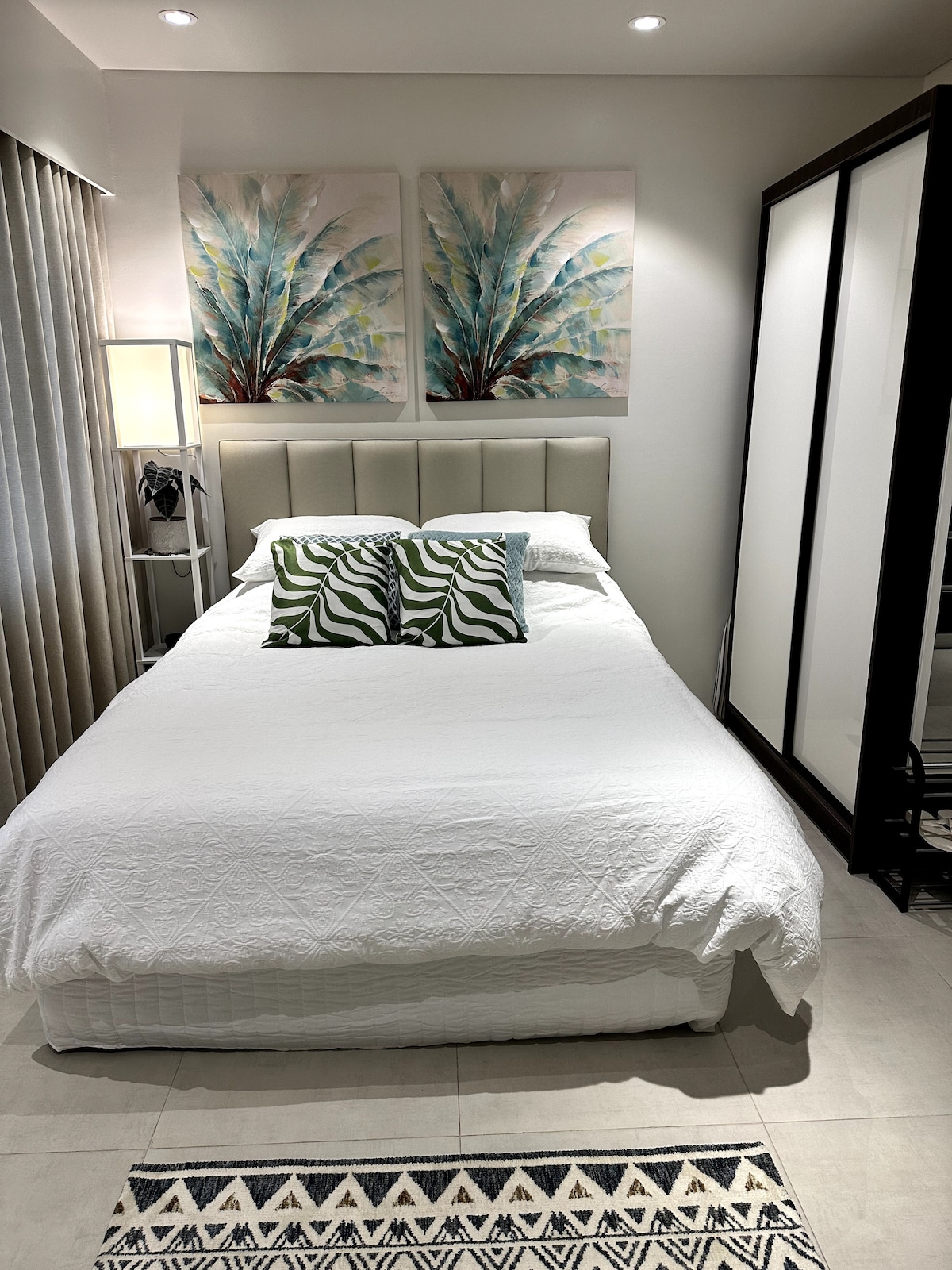 Toto stylové ubytování je ideální pro čtyřčlennou rodinu. Všechny spotřebiče a nábytek jsou zcela nové. Toto je naše rekreační ubytování, žádáme vás pouze, abyste se o naši jednotku postarali. - 50" TV – Postel velikosti Queen s jednolůžkovou rozkládací postelí - Rozkládací pohovka - Jídelní stůl pro 2 osoby - Spousta skříní - PLDT Wi-Fi - Příbory - Rýžovar - Lednice - Elektrická konvice - Žehlička - Ohřívač vody - Vstup bez klíče