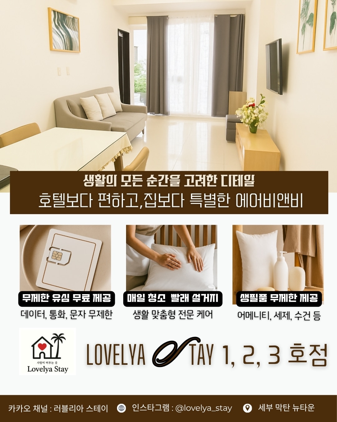 러블리아 스테이는 같은 컨디션, 같은 서비스를 제공하는 1, 2, 3호점이 있습니다. 호스트의 다른 숙소 확인을 통해 상세 정보를 확인 하실 수 있습니다 :) ㅋㅏㅋㅏ오 채널 : 러블리아스테이 사랑이 머무는 곳, Lovelya Stay No.1 🤍 🤍 탁 트인 씨뷰와 함께 시작되는 하루. 🤍 생활의 모든 순간을 고려한 디테일. 🤍 ‘호텔보다 편안하고, 집보다 특별한’ 휴식처. 🤍 막탄에서 가장 쾌적한 뉴타운에서, 깔끔하게 정돈된 세부를 만나보세요 - 오래 머물고 싶은 공간 Lovelya Stay. 당신의 세부 여행에서 가장 편안했던 공간으로 기억되길 바랍니다. - 💕 세부 라푸라푸시 막탄 뉴타운(Mactan Newtown, Lapu-Lapu City, Cebu) ➖➖➖➖➖➖➖➖➖➖➖➖➖➖➖