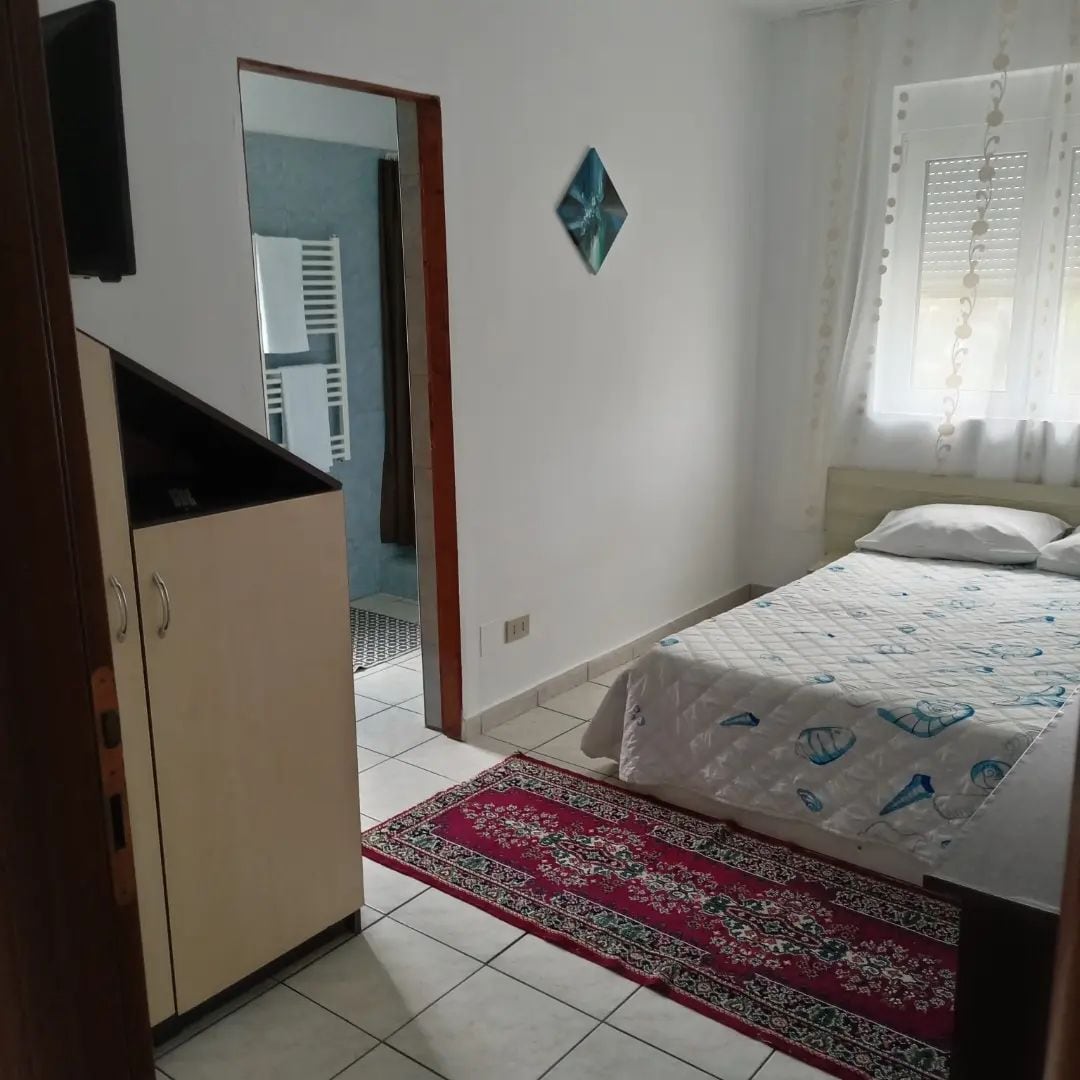 The room is small and intimate, with parquet, the size of the room is 3x3 and the bathroom is 3x1.60 meters! room 1 and room 2 are located upstairs and have a common terrace with sofas, tables and sun loungers! On the ground floor there is a large kitchen equipped with everything you need and a large terrace with sofas and tables in front of a 250 meter garden with lawn and flowers and 2 swings! Rooms 1 and 2 are air conditioned! The distance to the city center is 5 minutes walk !