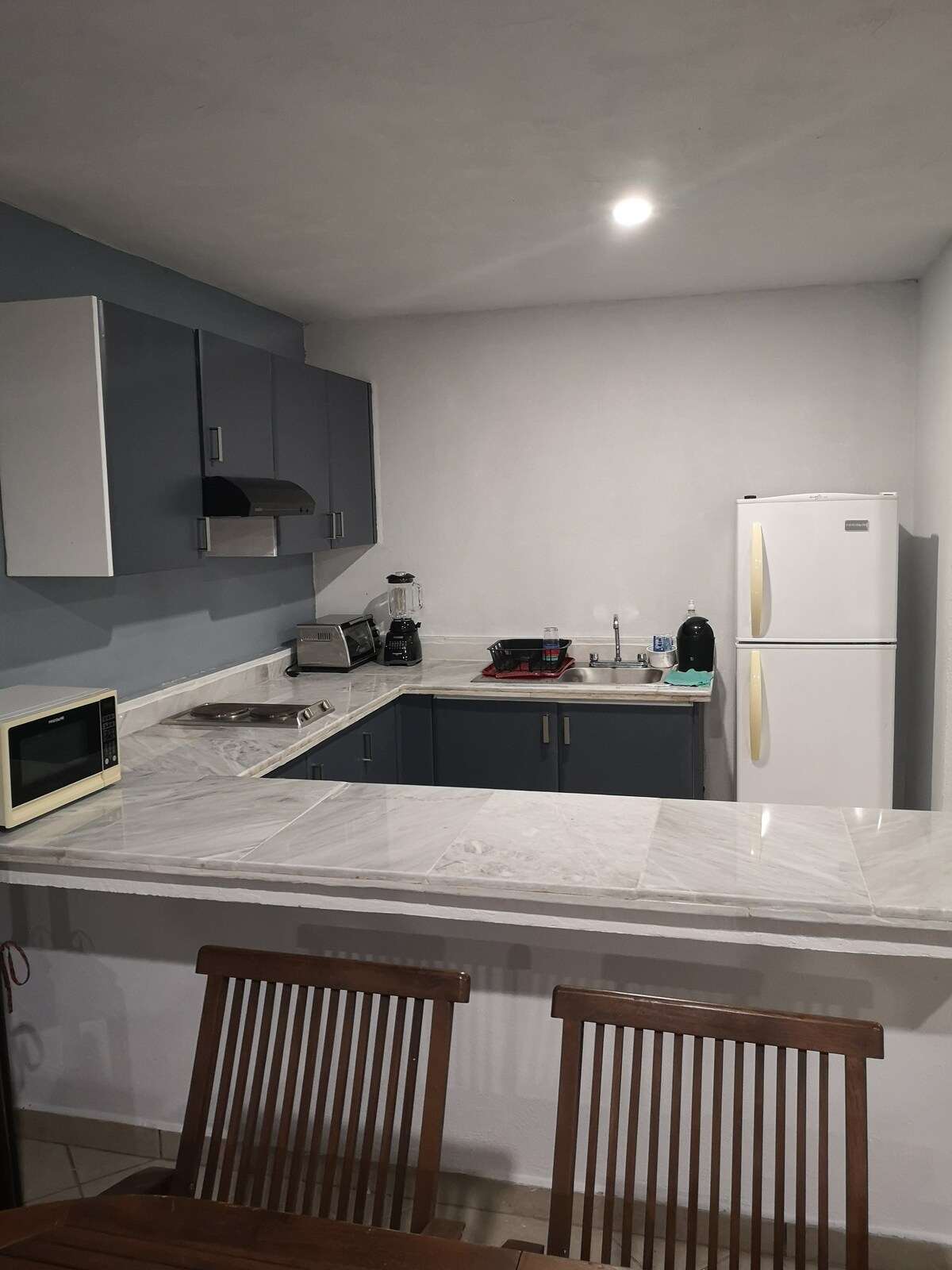 Funkční chalupa, ideální pro páry. Přímý přístup k JEZERU; PLÁŽ přes ulici. 1 ložnice s manželskou postelí, 42" TV, klimatizace, koupelna, obývací pokoj a jídelna pro 4 osoby, vybavená kuchyně, malá terasa a útulná výzdoba. SPOLEČNÉ PROSTORY: sdílej velký bazén, palapu a molo s ostatními 3 domy na stejném pozemku. Palapa má obývací pokoj, jídelnu a kuchyň, které mohou hosté využívat. Zahrnuje parkování pro 1 auto. SAZBA SE MĚNÍ, POKUD JSOU TO 2, 3 nebo 4 OSOBY.