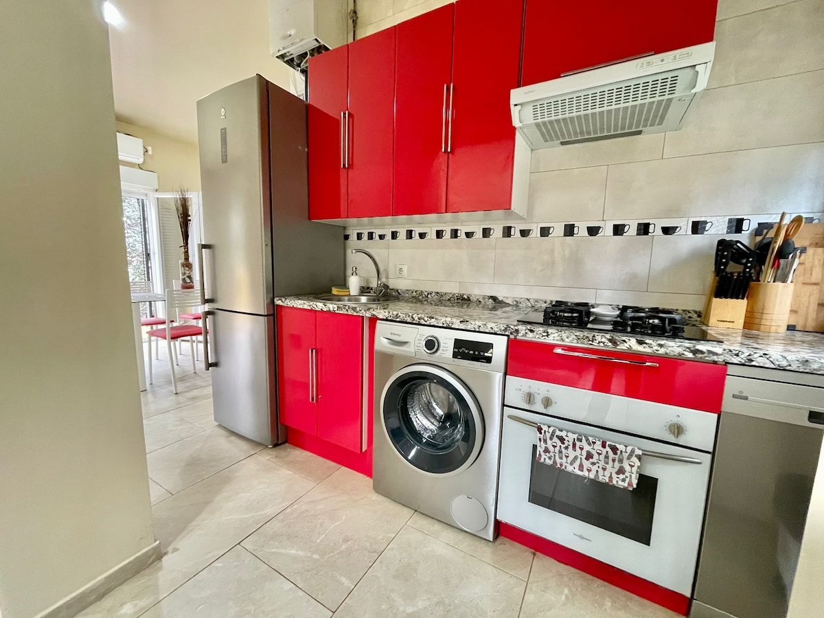 Byt na úrovni ulice. Ideální pro služební cesty, studijní cesty, lékařské záležitosti atd. s keramickou varnou deskou, lednicí, pračkou/sušičkou, myčkou nádobí, čerpadlem na horký/studený vzduch, mikrovlnnou troubou, Nespresso, kompletním kuchyňským náčiním, rychlovarnou konvicí, manželskou postelí, rozkládací pohovkou 190x150, chytrou TV, Wi-Fi, alarmem, přímou linkou metra do Sol (15"), velkou koupelnou, dešťovou sprchou, automatickými dávkovači gelu. Zahradní plocha, velmi snadné parkování, se dvěma dětskými hřišti s houpačkami