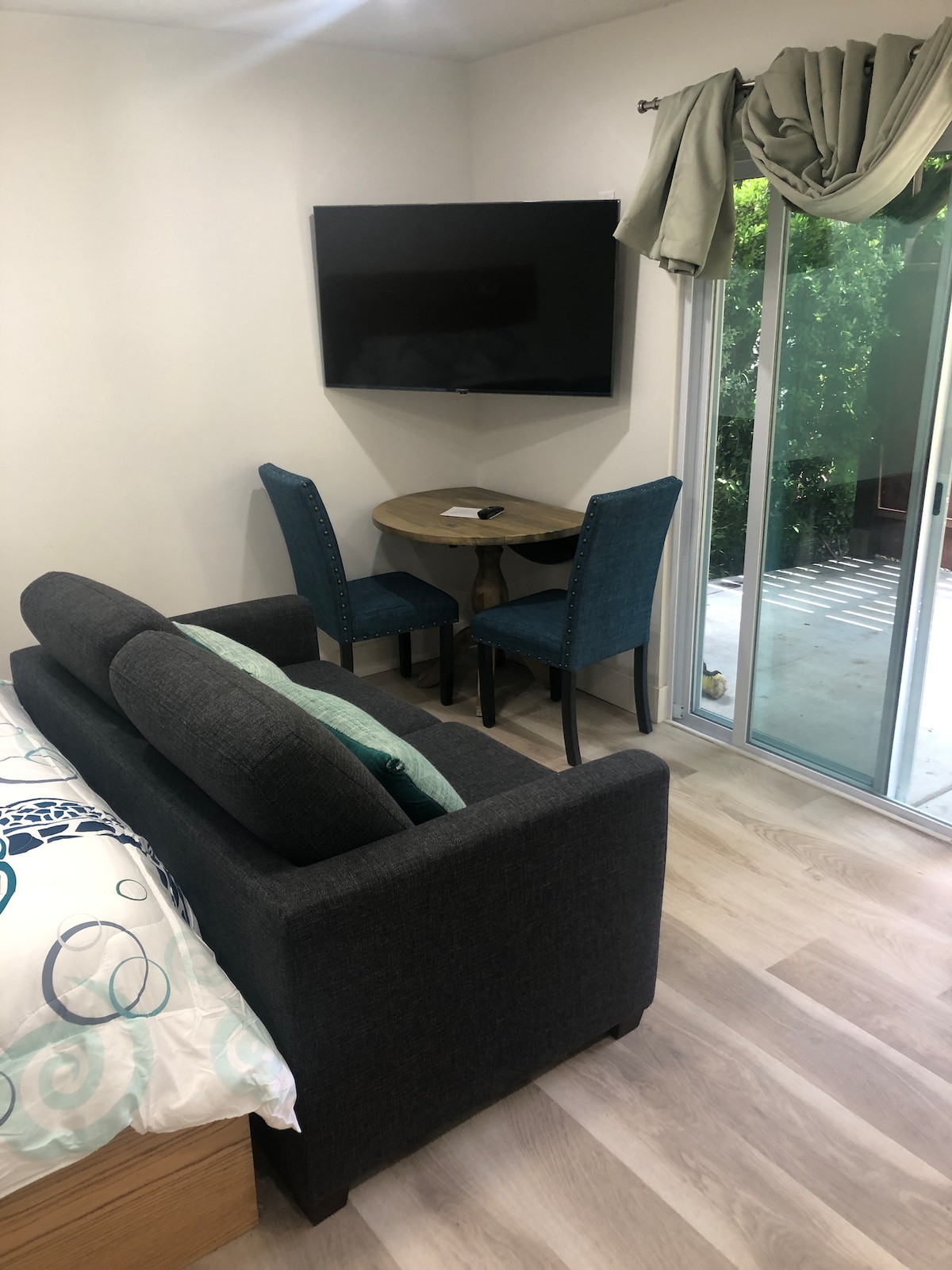 Guest house is attached to our primary residence but has a separate exterior entrance. The interior is separated by double doors that lock from both sides, similar to adjoining hotel rooms. The backyard is shared by us, the owners. There’s a very real chance you’ll be greeted by our friendly Australian Shepherd, Gracie, during your stay! You may see us in the yard during your stay. Feel free to say hi! Otherwise, we like to give our guests privacy.