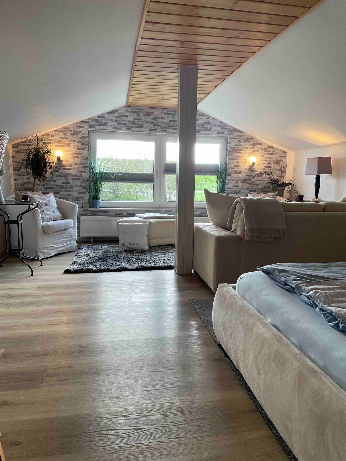 Náš útulný, velmi světlý byt o rozloze cca 70 m² v přízemí s charakterem samostatně stojícího domu nabízí obývací/jídelní kout o rozloze cca 40 m² s otevřenou kuchyní, jídelním koutem a krbem, kancelářskou místností, sprchovým koutem se sprchovým koutem, samostatnou ložnicí, velkou krytou terasou se saunou a vířivkou a zarostlou zahradou. Pláž, centrum města a nádraží jsou v pěší vzdálenosti asi 10–15 minut, nejbližší supermarket v bezprostřední blízkosti. Psi jsou tady vítáni!