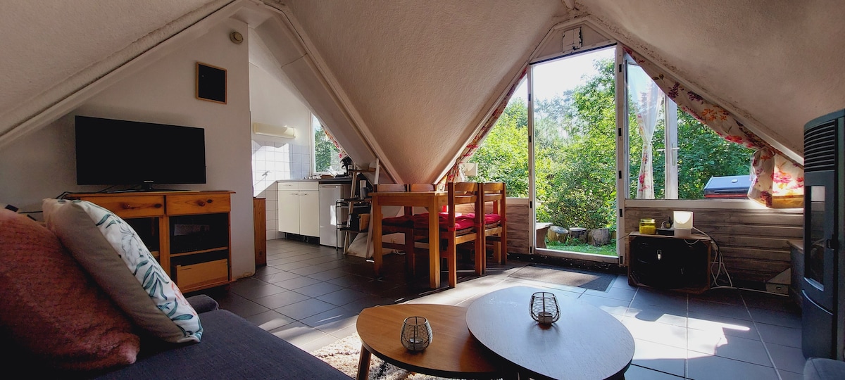 Okouzlující chata uprostřed lesa. Přijeďte objevit tuto neobvyklou chatu o rozloze 32 m2. Oceníte nádherný výhled, terasu orientovanou na jih s výhledem do údolí / přírodního lesa, probuzení se za zpěvu ptáků, sledování veverek, ... Klid a odpočinek zaručeny. Můžete si užít 145 km značených turistických stezek a naučný les v okolí ubytování a možná se nechat překvapit uměleckými díly na své cestě? Nebo si prostě odpočiňte v plně vybavené chatě