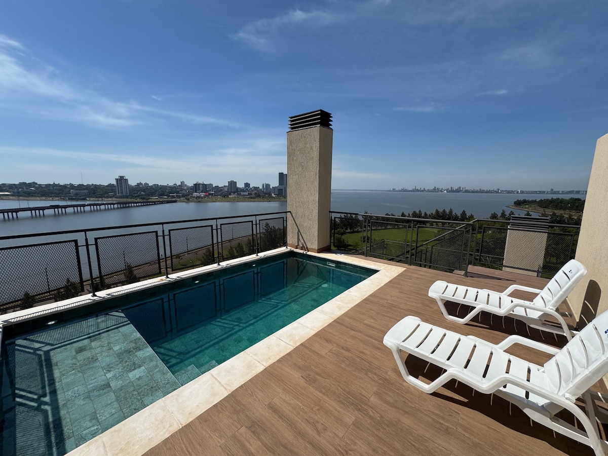 Descubre nuestro acogedor apartamento en una zona céntrica y segura. Disfruta de un balcón con vista al río Paraná y relájate en la terraza con piscina. Además, cuenta con parrilla para tus asados y estacionamiento. El lugar ideal para tu escapada!