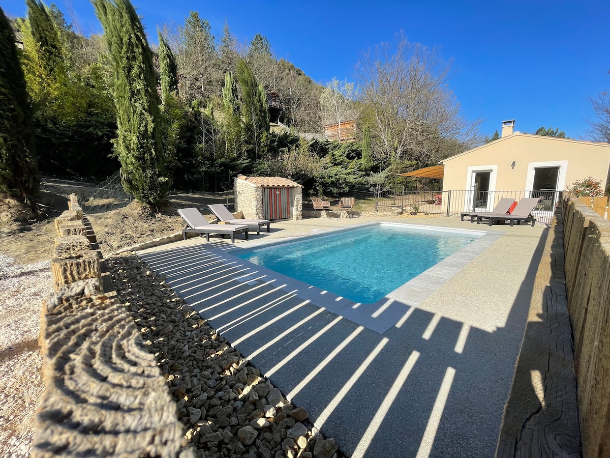 Pod zámkem Entrechaux, přilepená ke skále, se nachází vila orientovaná na jih. V době aperitivu si můžete vychutnat výhled na vesnici z velké chráněné terasy. Na východě uvidíte Mont Ventoux. Soukromý bazén zabezpečený roletou a vyhřívaný na 24 °C od 15. dubna do 15. října. Plně vybavená kuchyně s americkou lednicí, kávovarem Nespresso, myčkou nádobí a mikrovlnnou troubou Vám usnadní pobyt. Praní a sušení prádla zdarma