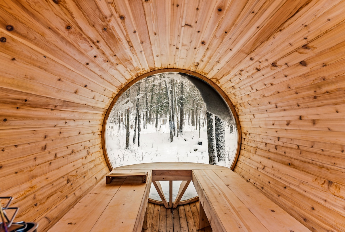 Chalet Creme je moderní chata s jasným designem a úžasným výhledem na přírodní krásy skrze velká skleněná okna. Nachází se v lese uvnitř vesnice Mansonville (Eastern Townships), 1h30 od Montrealu. Užijte si meditativní zážitek v sauně, přitulte se k milované osobě před krbem nebo si dokonce připravte lahodnou kávu v naší plně vybavené a rafinované kuchyni. Tento prostor je určen pro vytváření vzpomínek CITQ #308550