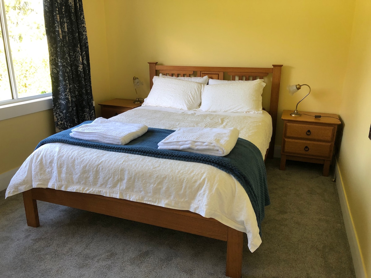 On the bank of the Don River, just 15 minutes from Devonport, the two bedroom unit attached to our home has a private entrance, two queen beds with an extra single bed and/or cot on request. If reserving for 1 or 2 guests, only one bedroom will be accessible unless communicated at the time of booking. The unit has fridge, microwave, coffee machine and dining setting. BBQ in the undercover courtyard for guests. Continental breakfast included. There is no kitchen sink so we do the dishes!