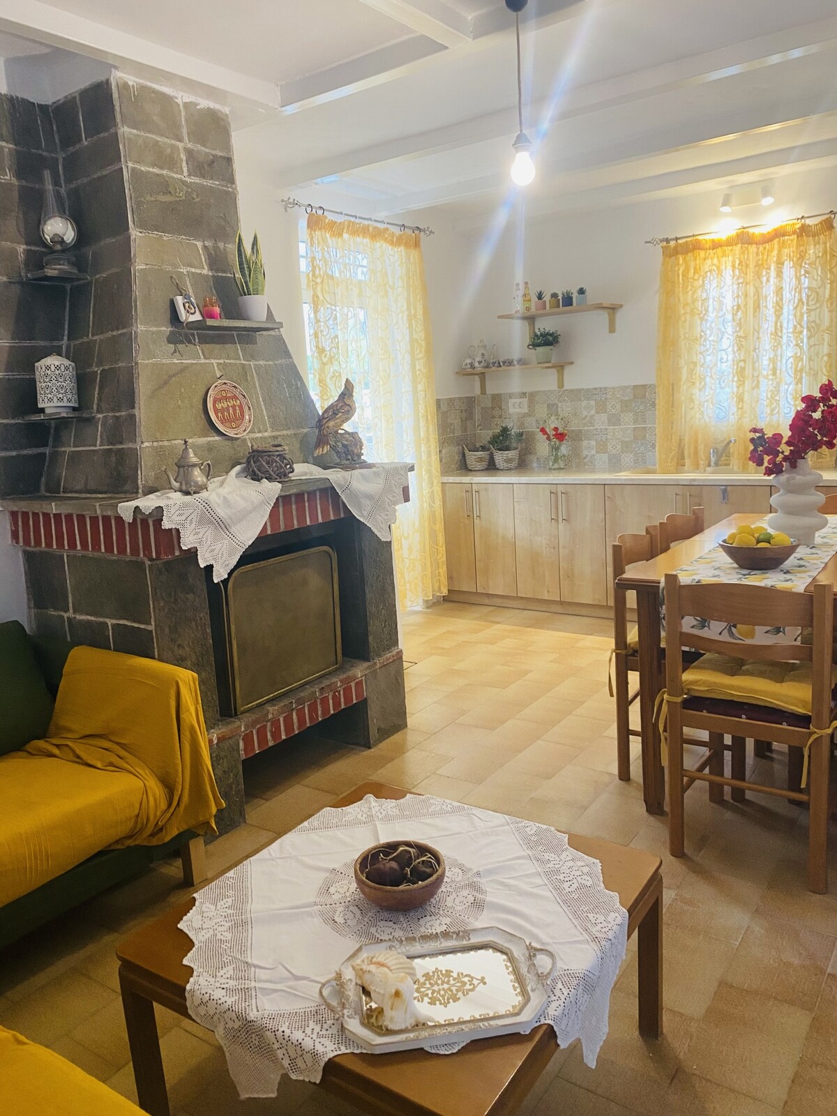 Dům babičky a dědy byl vždy otevřený pro celou rodinu , přátele a sousedství. Nyní je k dispozici těm, kteří chtějí strávit dovolenou v klidné a tradiční vesnici Exo Chora. Ručně vyráběné háčkované semedaky zdobí náš nábytek a majestátní krb. Z velkých oken je panoramatický výhled na vesnici a dlážděná plátna. Vychutnej si řeckou kávu na terase a v útulné zahradě a dopřej si vzpomínky na minulou éru.