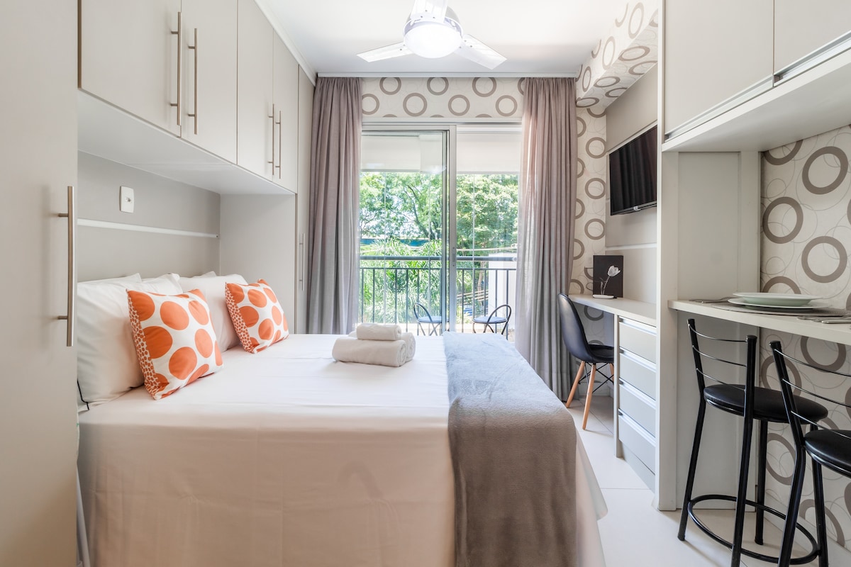 O apartamento conta com cozinha equipada, banheiro com chuveiro elétrico , ambiente único com ar condicionado, condomínio possui toda estrutura para curtos períodos de viagem como lavanderia e mini mercado, além de conter academia e piscina no último andar. Está localizado a 800 metros do Terminal Rodoviário do Tietê (metro e rodoviária), a 1,5km do complexo Anhembi (sambódromo e centro de exposição), a 2 km do Expo Center Norte e Shoppings Center Norte e Lar Center.