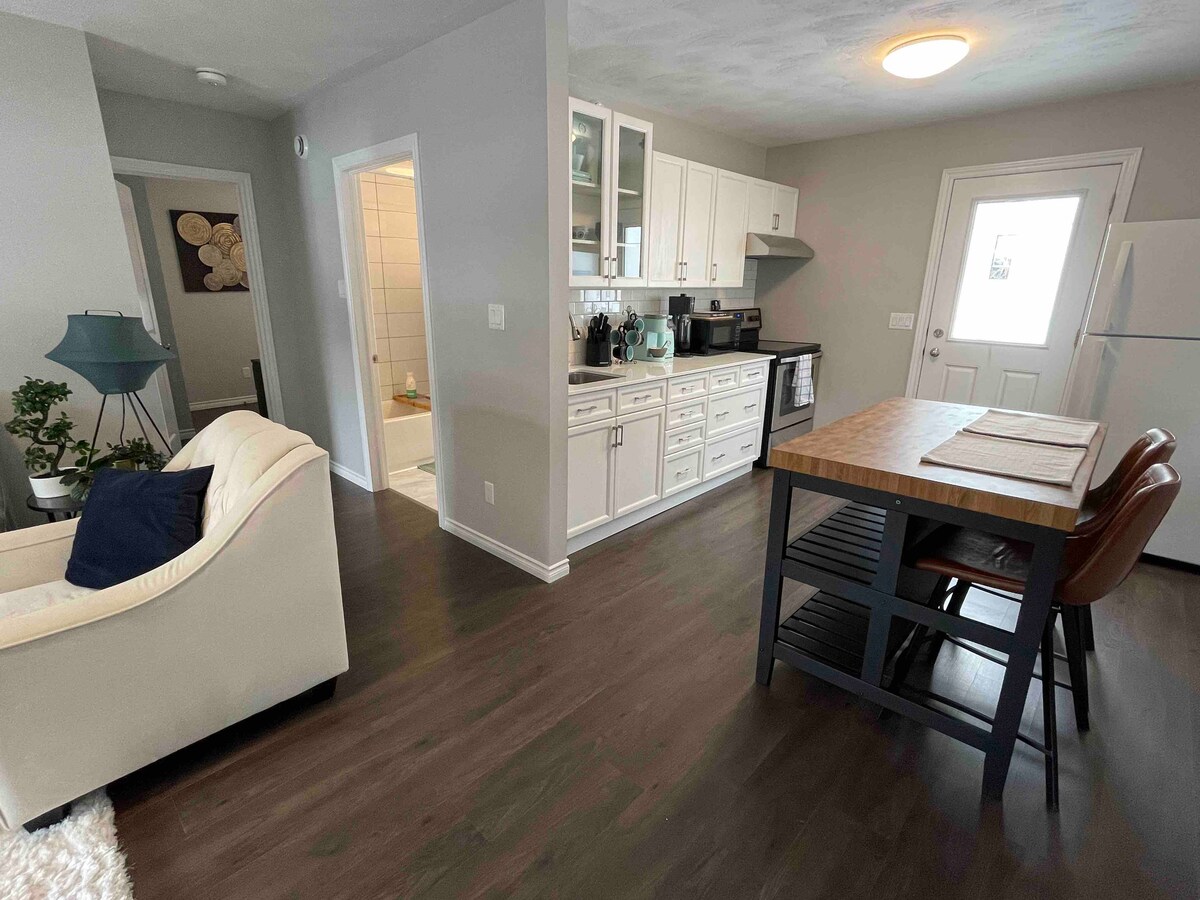 Vítejte v naší centrálně umístěné soukromé jednotce. Velká okna pro rozjasnění plně zásobené kuchyně, zábavní prostor s 55" chytrým televizorem, stolní hry, gramofon, pohodlná ložnice s manželskou postelí a klimatizací a velká koupelna. Užijte si soukromý venkovní prostor vedle svého osobního parkovacího místa. Kuchyně zahrnuje: - Toustovač – Kávovar Keurig + opakovaně použitelné šálky - Sporák - Rychlovarná konvice - Hrnce a pánve - Nádobí a další kuchyňské potřeby - Mikrovlnná trouba - Mini lednice s mrazicí přihrádkou