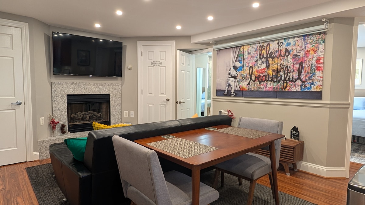 Tento byt se soukromým vchodem se nachází v klidném prostředí poblíž Washingtonu, D.C. a nabízí světlé a vzdušné uspořádání navržené pro pohodlí. Obývací pokoj/jídelna/kuchyň s krbem, 65" TV, knihy a hry, plně zásobená kuchyň a cvičební vybavení. Ložnice s manželskou postelí s proslule pohodlnou matrací z paměťové pěny, druhá ložnice s dvojitou rozkládací pohovkou + vysouvací postelí, plně vybavená koupelna se sprchou/vanou, gigabitové Wi-Fi, stoly, veranda + gril. 10 minut do metra, 20 minut do DC a 5 minut do Greenspring Senior Living Community.