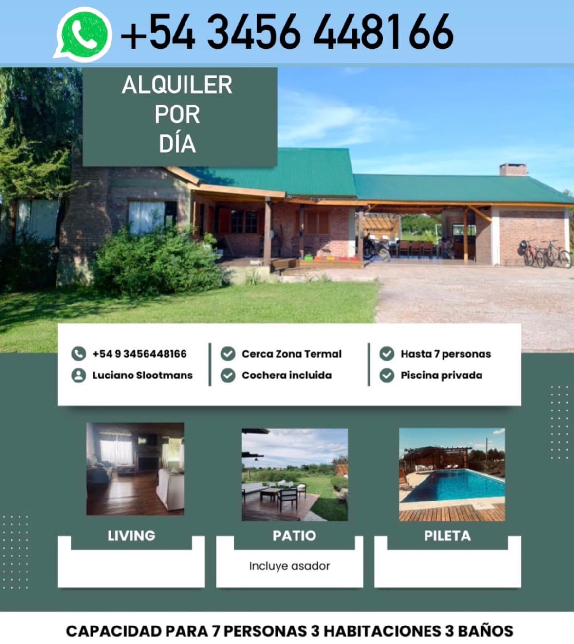 Casas de Campo 3 ambientes ubicadas en Zona Norte, Federación. Las mismas se encuentran ubicadas 1.200 mts del complejo termal. Cada una de las casas cuentan con cocina completa, dormitorio principal con vestidor y baño en suite, segundo dormitorio con comodidad para 3 personas. Baño principal. Amplio Living comedor. Parrilla y parque. Televisor Smart tv c/Directv. Aire Acondicionado en los 3 ambientes. Ropa de cama, toallas y toallones. Totalmente equipada. Cochera techada. Zona de quintas.