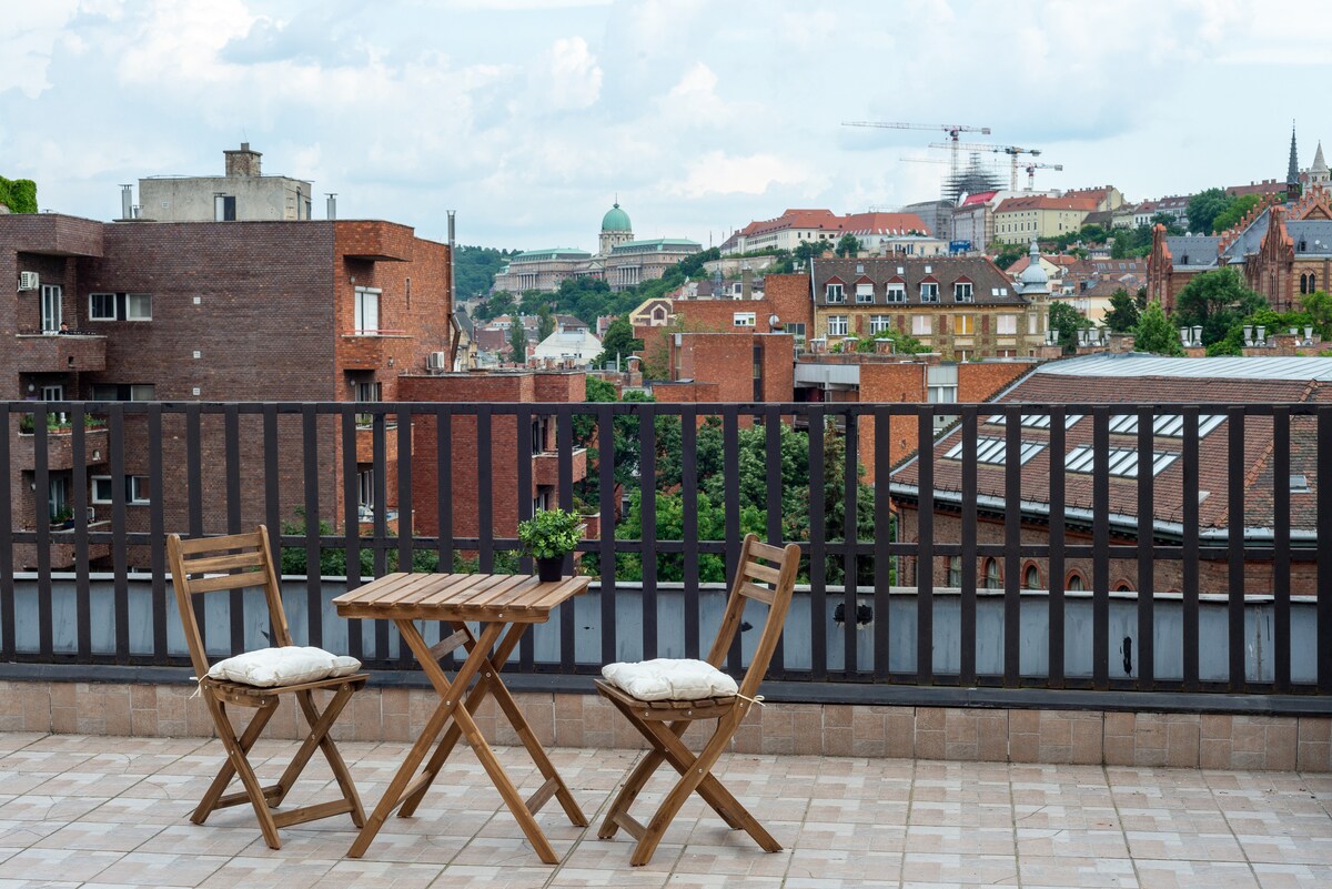 Vítejte v tomto nádherném dvoupokojovém apartmánu s jedinečným interiérem, úžasným výhledem a neuvěřitelným panoramatem – z velkého balkonu budete mít přímý výhled na ikonický Budínský hrad a z ložnic ve stylu hotelu se před očima rozprostírá fascinující panorama na Dunaj a Řetězový most. Z hlediska lokality je tento luxusní apartmá skutečným pokladem a pokud jde o vybavení, je zahrnuto vše, co byste mohli potřebovat – od klimatizace až po kávové kapsle.