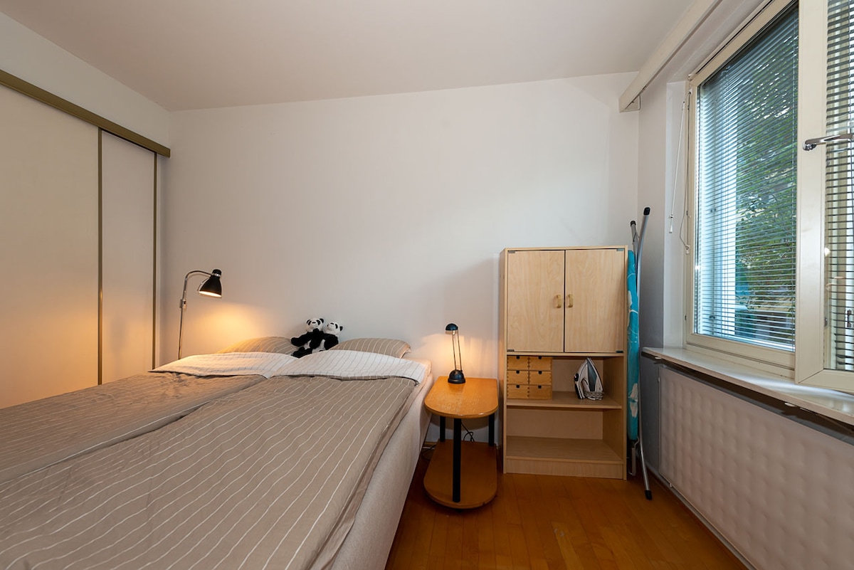 Highly functional and fully furnished apartment located in a nice green area between the center and the airport. This is the ideal base for a short or longer stay in Helsinki. Nice ambience and quality I call it basic plus. The apartment has a practical floor-plan with the living room and the bedroom located at each end and the kitchen, hall and bathroom in the middle. Located close to train (10 mins.), bus-stops (2 mins.) and 24h food stores. Free parking!