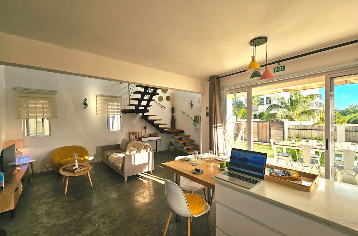 Výhledy na hory jsou pro ptáky! ;-) Tento útulný domov se nachází v centru, 350 metrů od dobře zásobeného supermarketu a 3 minuty jízdy od pláže, vás zve k relaxaci nebo k širokému výběru restaurací v okolí. V poklidné slepé uličce, obklopené zelení, si vychutnat posezení na dřevěné terase s výhledem na společný bazén nebo relaxovat na balkóně v 1. patře při sledování nádherných tropických západů slunce a moře s výhledem na Le Morne. Úklidová služba třikrát týdně v ceně