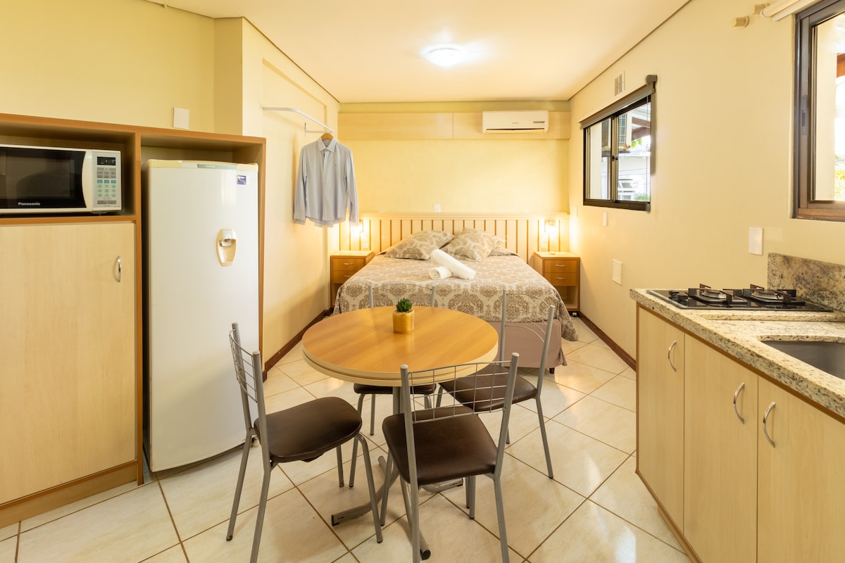 Apartmá Stand Casal je útulné a kompletní, pojme až 2 osoby, nachází se na skvělém místě, 150 metrů od pláže Cachoeira do Bom Jesus. Zařízené a dekorované prostředí. Apartmá je vybaveno manželskou postelí, minibarem, chytrými televizory, klimatizací a internetem. **POZOR PŘI PROVÁDĚNÍ REZERVACE** Pokud je počet hostů v rezervaci nesprávně vyplněn, bude při příjezdu účtován poplatek za další hosty