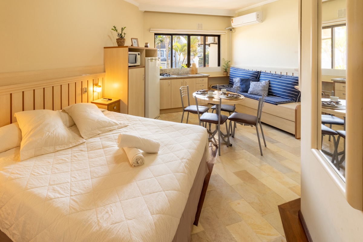 Hotel s italským šarmem. Luxusní studio. Boční výhled na moře a elegantní mezinárodní letiště Jurere. Věž 4. 4. patro. Rozdíly: rozkládací pohovka vysokého standardu. Kompatibilní s hotelovým ložním prádlem, ale zakoupeno v roce 2024 a používáno pouze rodinou. Nová vestavěná skříňka (2025) v koupelně. Klíč mezi předsíní (rozkládací pohovkou) a ložnicí. Spojené apartmá je také naše a je inzerováno. V případě zájmu se zde mohou ubytovat větší rodiny až 8 osob. Zkontrolujte dostupnost.